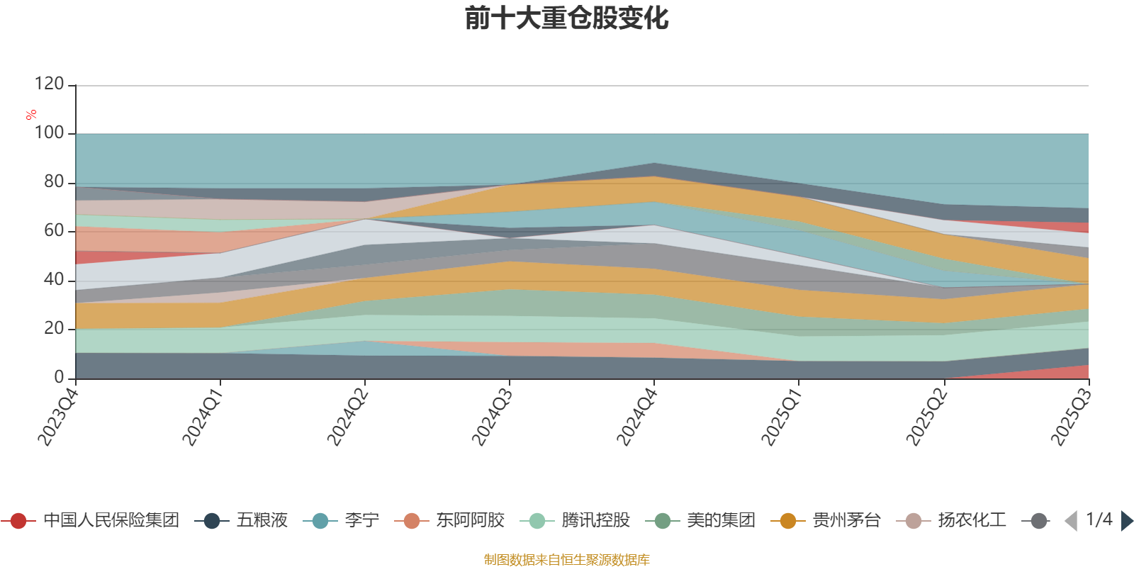 该基金持股集中度较高,近2年前十大重仓股集中度长期超过60%。截至2025年三季度末,基金十大重仓股分别是腾讯控股、阿里巴巴-W、贵州茅台、五粮液、羚锐制药、宁波银行、中国人民保险集团、美的集团、赛轮轮胎、山西汾酒。