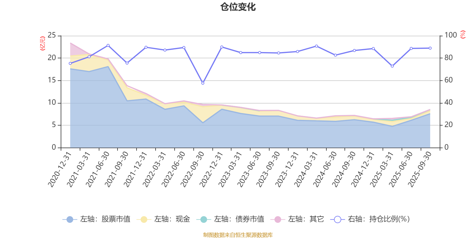 据定期报告数据统计,近三年平均股票仓位为85.78%,同类平均为85.88%。2021年上半年末基金达到91.34%的最高仓位,2022年三季度末最低,为57.62%。