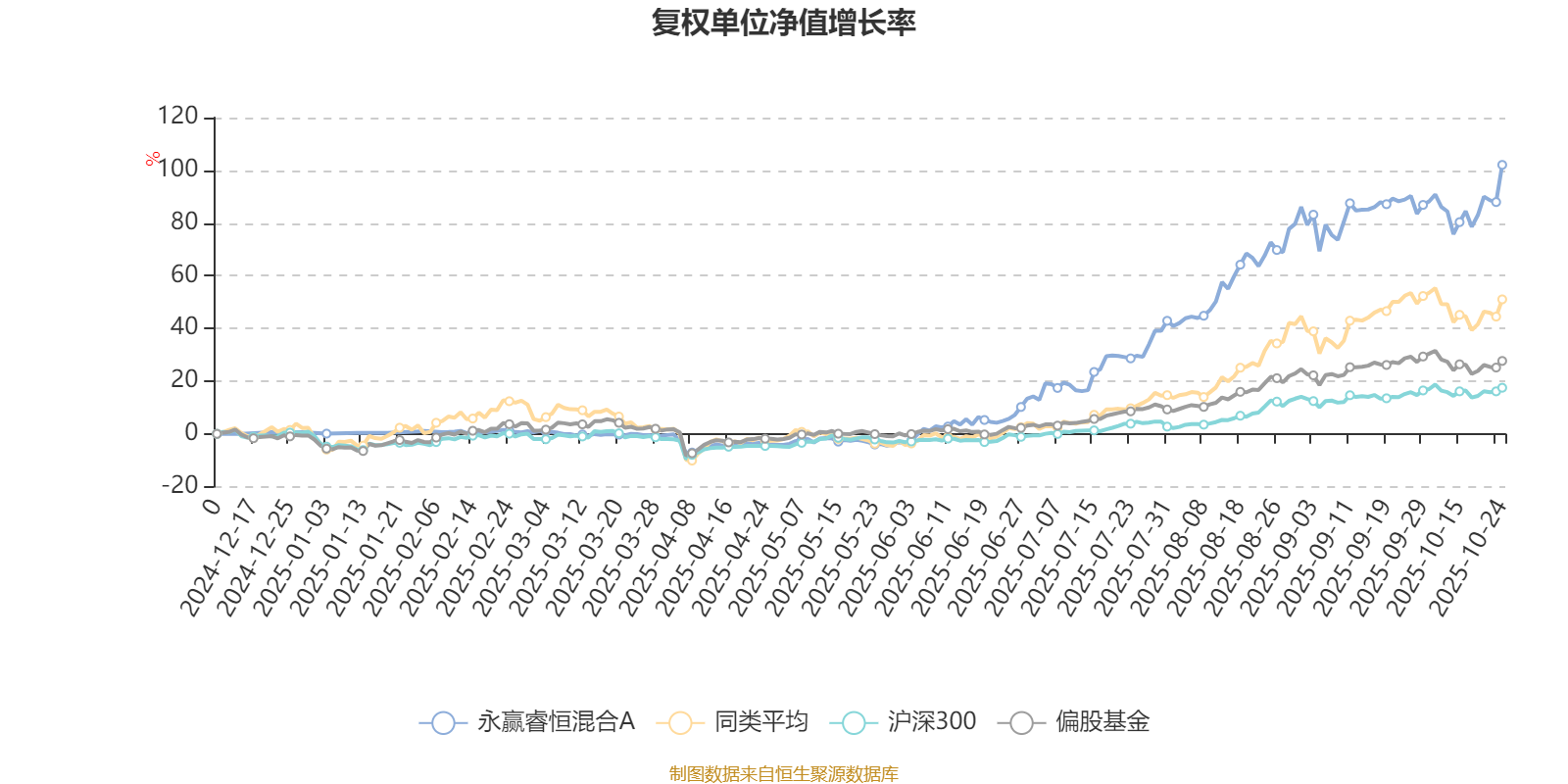 截至10月24日,永赢睿恒混合A近三个月复权单位净值增长率为55.84%,位于同类可比基金29/229;近半年复权单位净值增长率为110.98%,位于同类可比基金11/229。