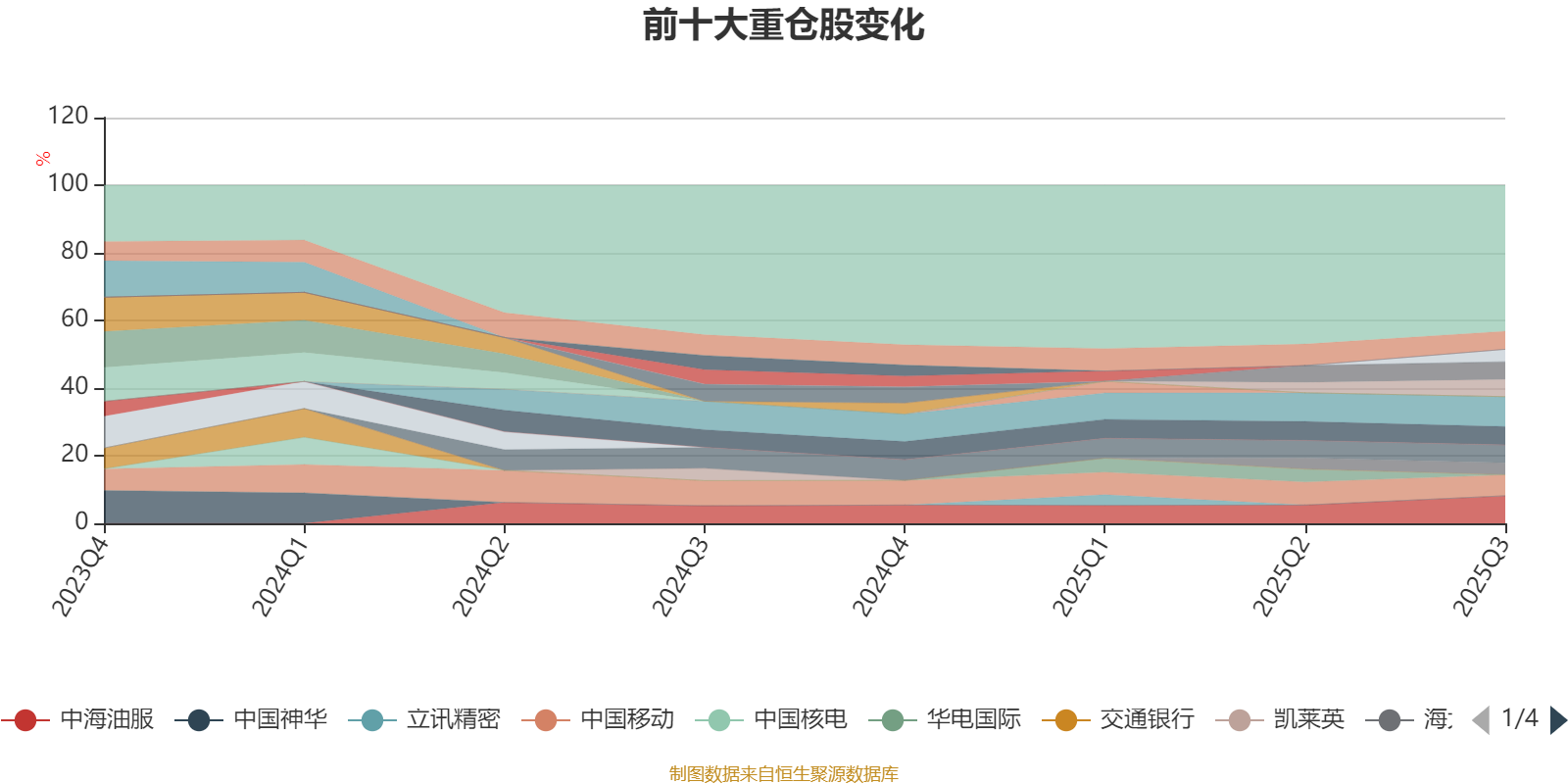 该基金持股集中度较高。截至2025年三季度末,基金十大重仓股分别是宁德时代、中海油服、中国移动、华能国际、中国电信、青岛啤酒、马应龙、顺丰控股、天山铝业、海大集团。