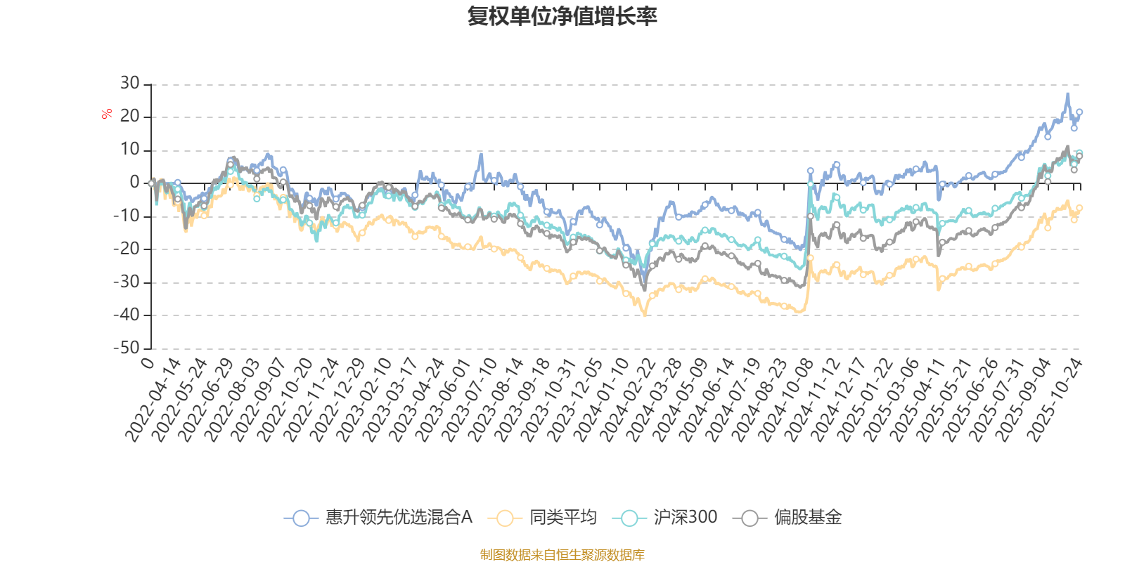 截至10月24日,惠升领先优选混合A近三个月复权单位净值增长率为12.40%,位于同类可比基金354/689;近半年复权单位净值增长率为21.46%,位于同类可比基金432/688;近一年复权单位净值增长率为22.70%,位于同类可比基金382/653;近三年复权单位净值增长率为28.44%,位于同类可比基金82/363。