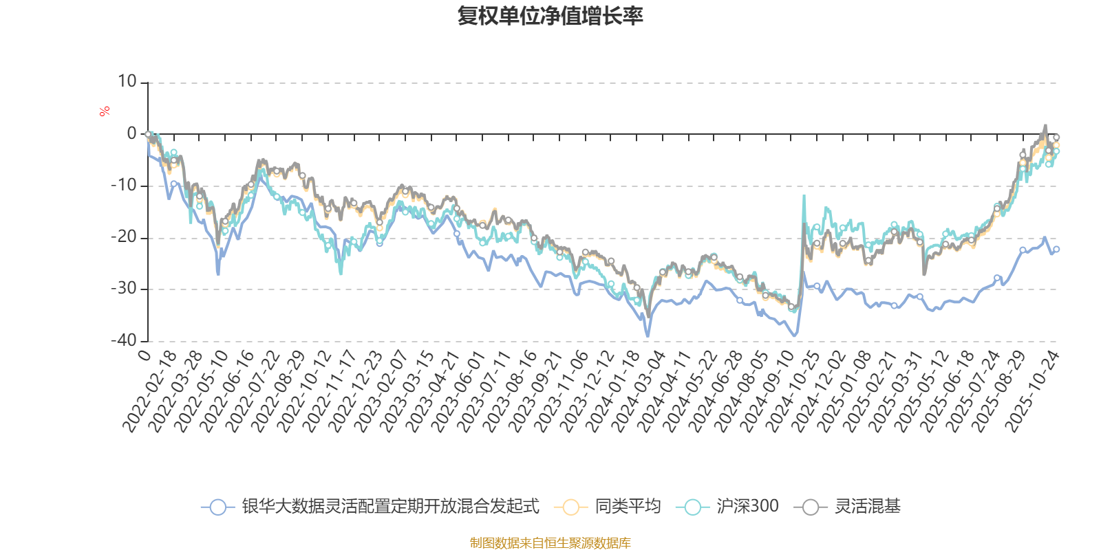 截至10月24日,银华大数据灵活配置定期开放混合发起式近三个月复权单位净值增长率为7.65%,位于同类可比基金799/1287;近半年复权单位净值增长率为16.98%,位于同类可比基金818/1287;近一年复权单位净值增长率为10.06%,位于同类可比基金950/1287;近三年复权单位净值增长率为-0.30%,位于同类可比基金977/1286。
