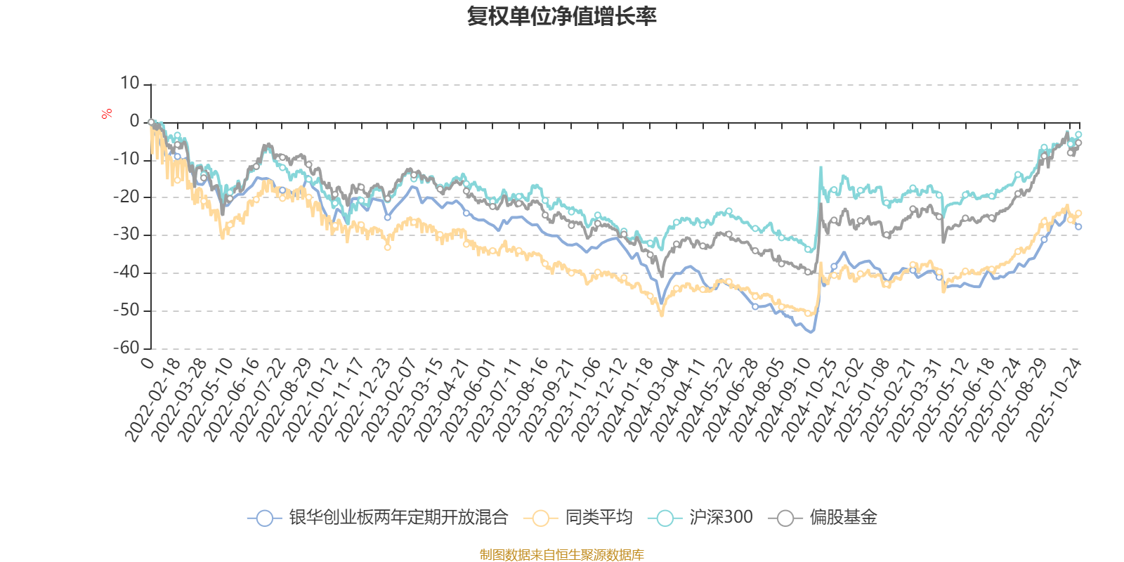 截至10月24日,银华创业板两年定期开放混合近三个月复权单位净值增长率为19.86%,位于同类可比基金188/621;近半年复权单位净值增长率为27.45%,位于同类可比基金317/618;近一年复权单位净值增长率为23.74%,位于同类可比基金363/611;近三年复权单位净值增长率为-4.83%,位于同类可比基金433/518。