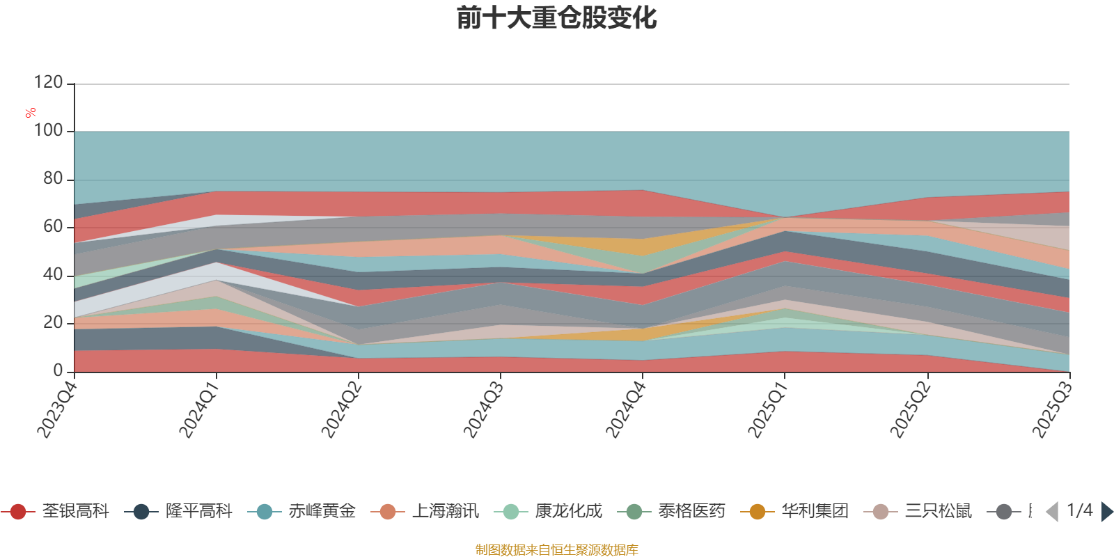 该基金持股集中度较高,近2年前十大重仓股集中度长期超过60%。截至2025年三季度末,基金十大重仓股分别是盛达资源、芒果超媒、温氏股份、寒锐钴业、潜能恒信、腾远钴业、赤峰黄金、迈瑞医疗、立华股份、金力永磁。
