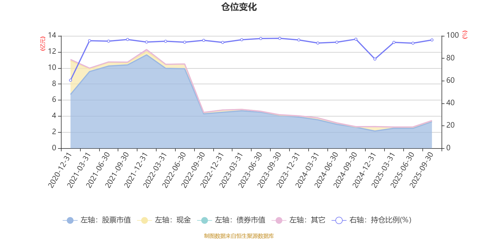 据定期报告数据统计,近三年平均股票仓位为94.24%,同类平均为85.51%。2023年三季度末基金达到97.78%的最高仓位,2020年末最低,为60.55%。