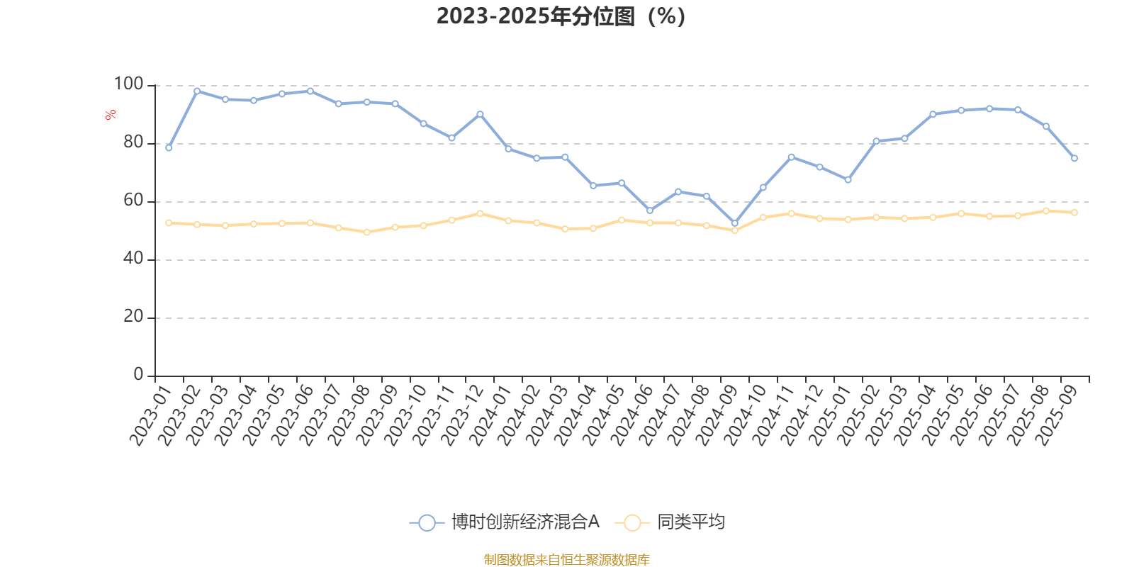通过所选区间该基金净值增长率分位图,可以观察该基金与同类基金业绩比较情况。图为坐标原点到区间内某时点的净值增长率在同类基金中的分位数。