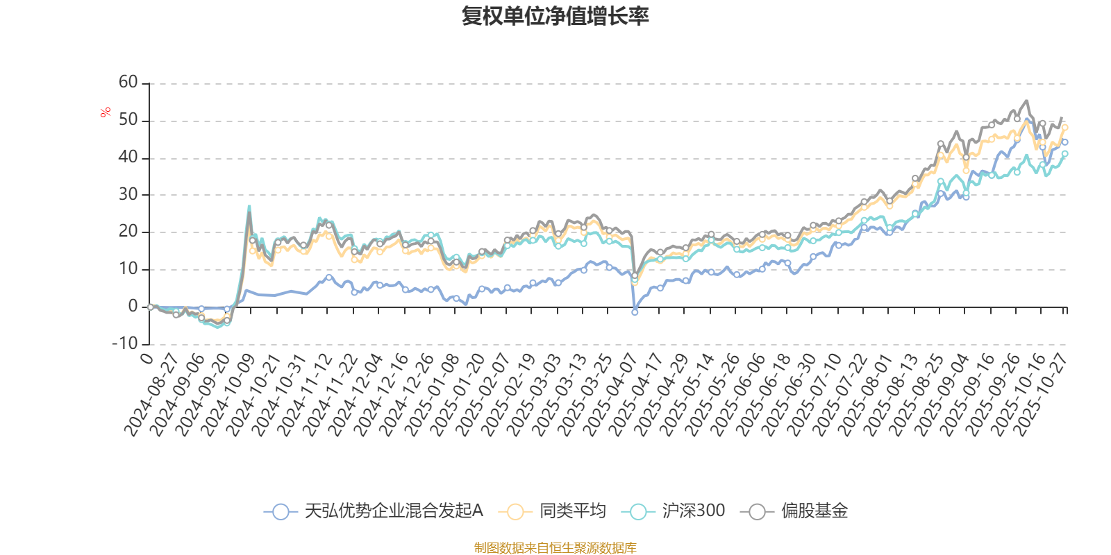 截至10月27日,天弘优势企业混合发起A近三个月复权单位净值增长率为18.77%,位于同类可比基金243/689;近半年复权单位净值增长率为34.25%,位于同类可比基金236/688;近一年复权单位净值增长率为38.33%,位于同类可比基金177/653。