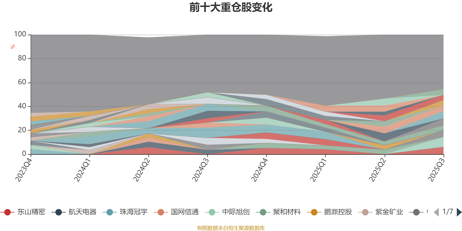 截至2025年三季度末,基金十大重仓股分别是中际旭创、工业富联、东山精密、腾景科技、中航沈飞、华虹半导体、兆易创新、新易盛、中芯国际、博迁新材。