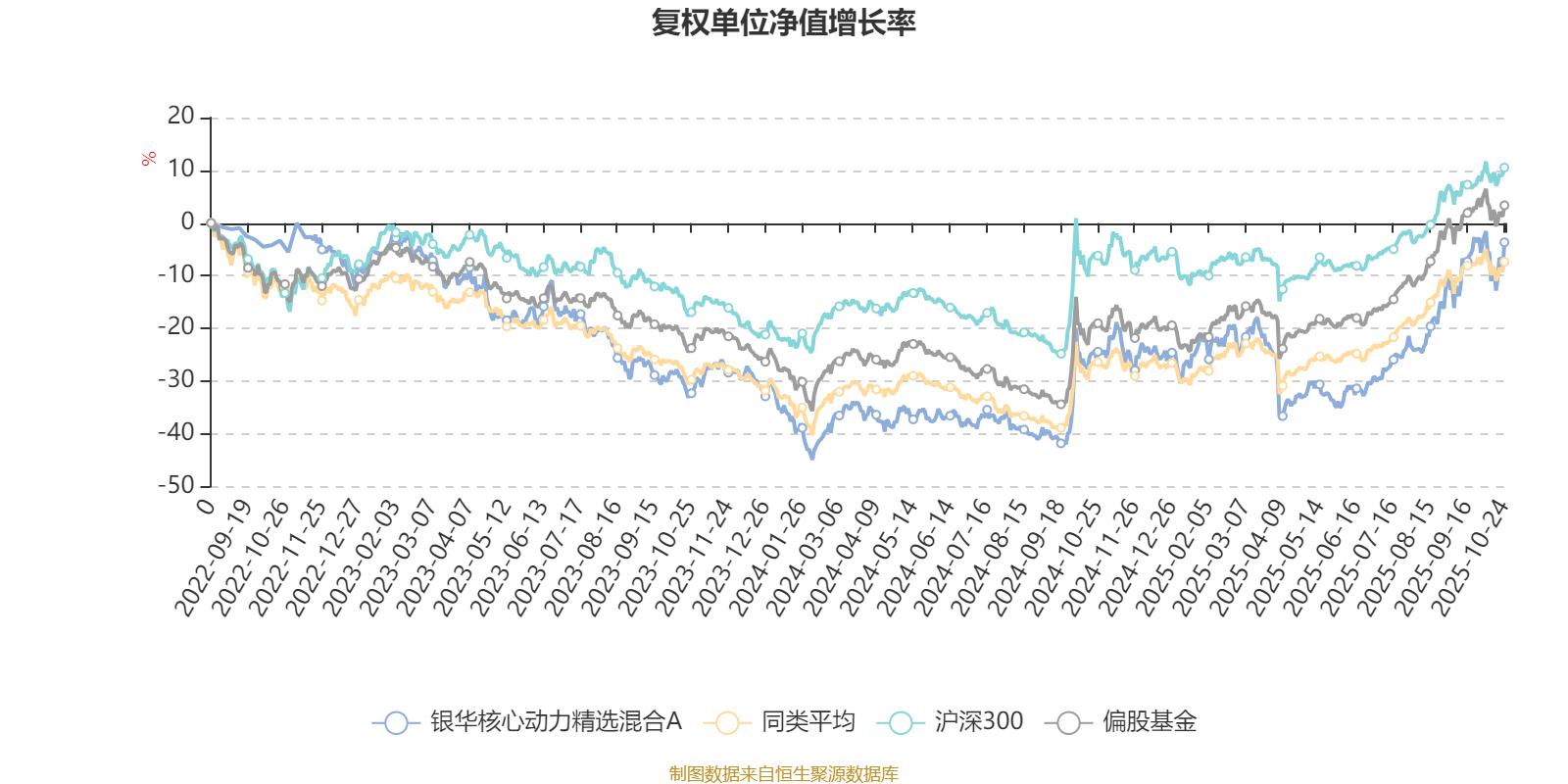 截至10月24日,银华核心动力精选混合A近三个月复权单位净值增长率为27.40%,位于同类可比基金95/689;近半年复权单位净值增长率为44.20%,位于同类可比基金101/688;近一年复权单位净值增长率为29.51%,位于同类可比基金277/653;近三年复权单位净值增长率为-0.33%,位于同类可比基金247/363。