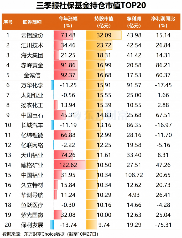 社保基金重仓股中今年整体股价表现向好,云铝股份、赤峰黄金、金诚信等均涨超70%,藏格矿业涨超120%。但也有小部分股票今年表现一般,万华化学、长城汽车、保利发展均跌超10%,太阳纸业、亿联网络、鱼跃医疗微跌。