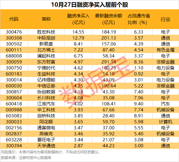 具体到个股,10月27日获融资净买入1亿元以上的有67只,其中19只融资净买入额超3亿元。胜宏科技融资净买入额居首,当日净买入14.55亿元,其次是中际旭创、新易盛,融资净买入金额分别为12.79亿元、8.41亿元,融资净买入金额居前的还有北方稀土、澜起科技、东方财富等。
