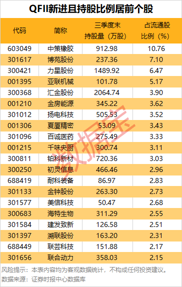 从持股看,已公布三季报公司中,360余家公司前十大流通股东名单出现QFII身影,超130股为三季度新进,其中,中策橡胶、博苑股份等20股QFII持股比例超2%。