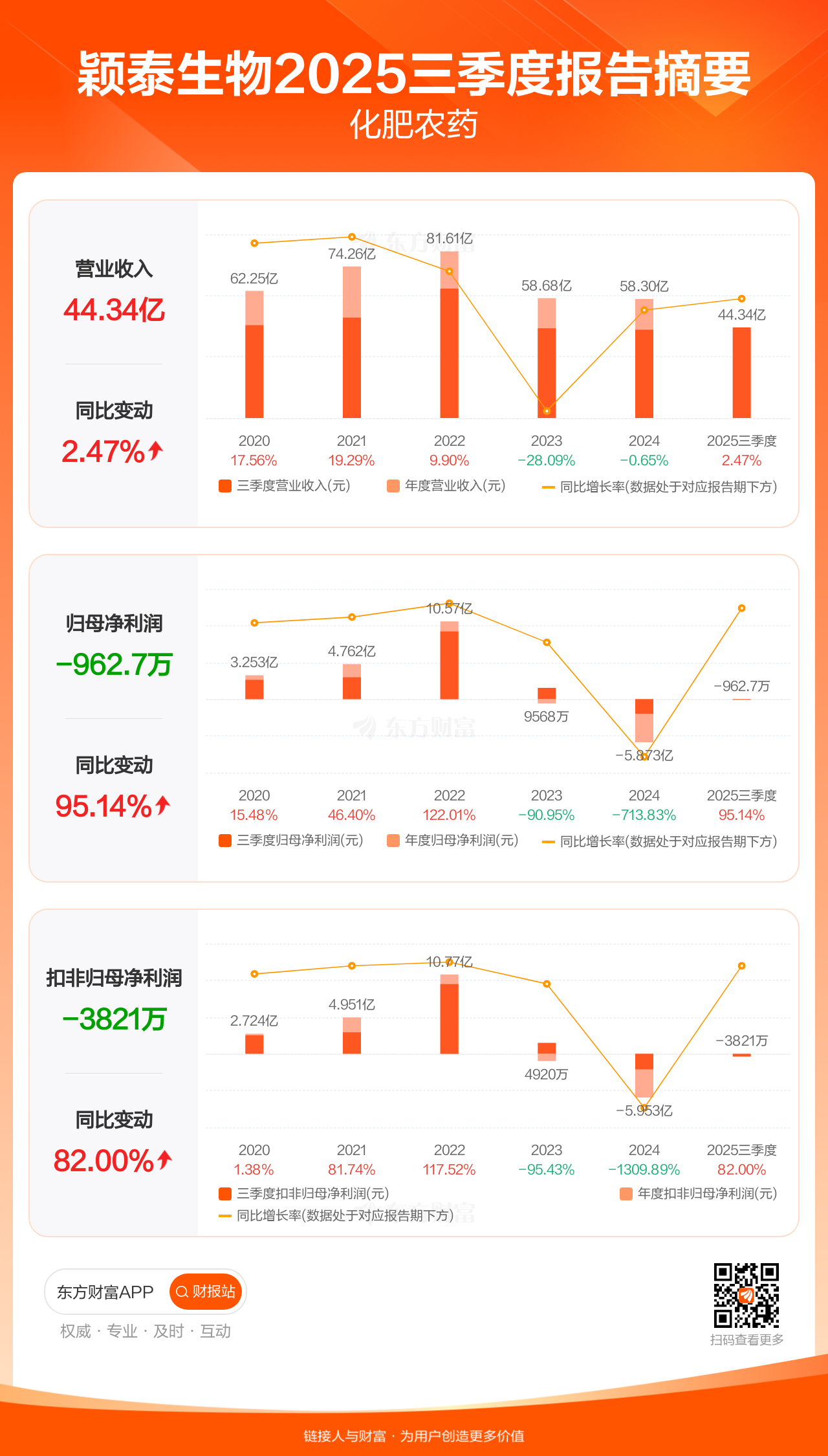 颖泰生物10月24日发布2025年三季报显示,公司前三季实现营业收入44.34亿元,同比增长2.47%;归母净利润-962.66万元;扣非归母净利润-3821.10万元。