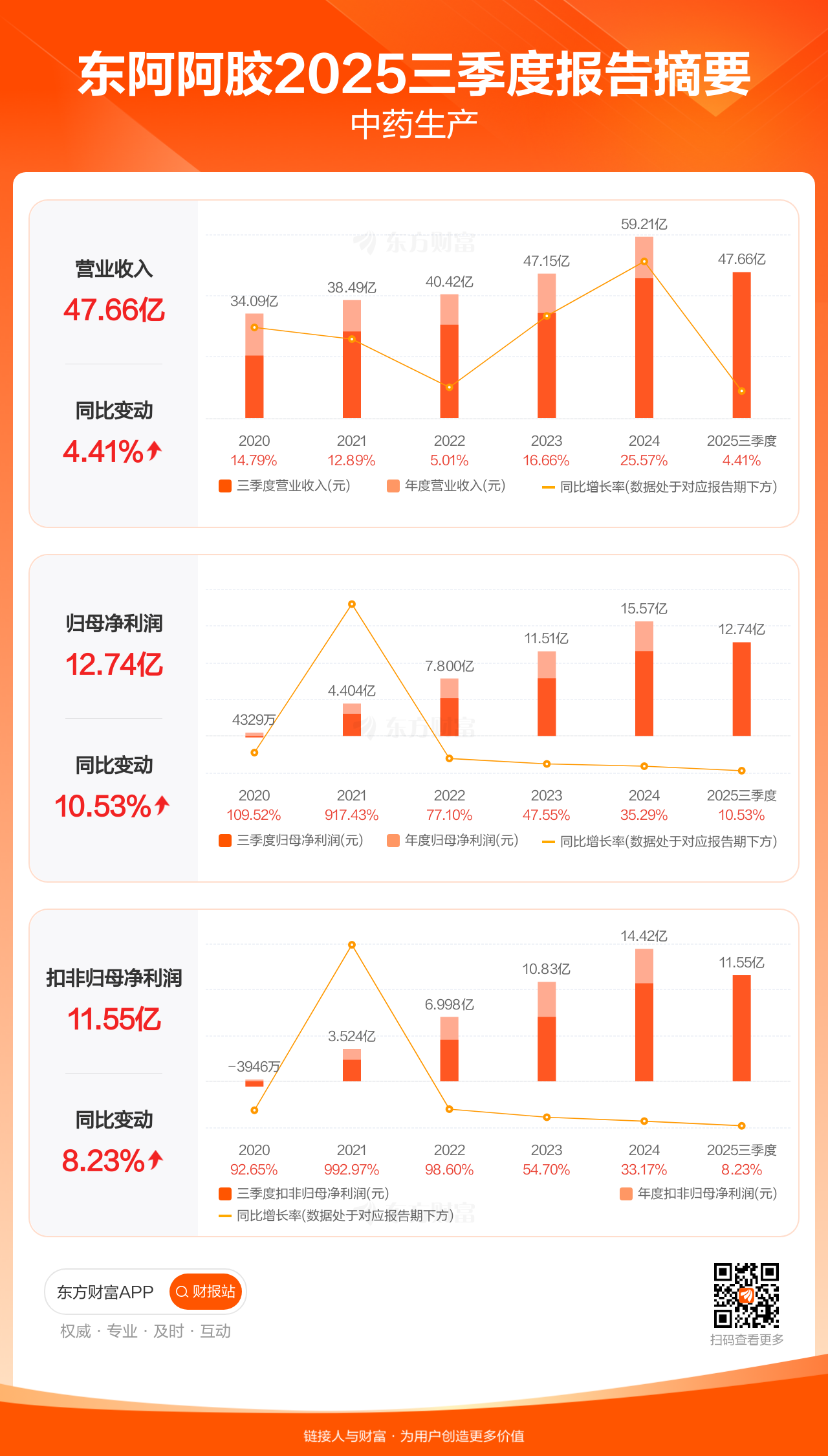 东阿阿胶10月25日发布2025年三季报显示,公司前三季实现营业收入47.66亿元,同比增长4.41%;归母净利润12.74亿元,同比增长10.53%;扣非归母净利润11.55亿元,同比增长8.23%。