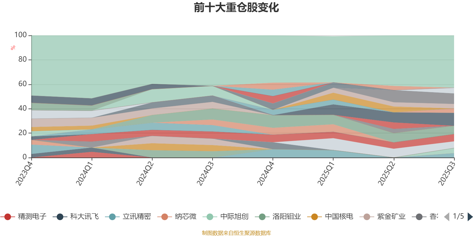 截至2025年三季度末,基金十大重仓股分别是中芯国际、胜宏科技、寒武纪、宁德时代、腾讯控股、安培龙、中际旭创、药明生物、绿的谐波、立讯精密。
