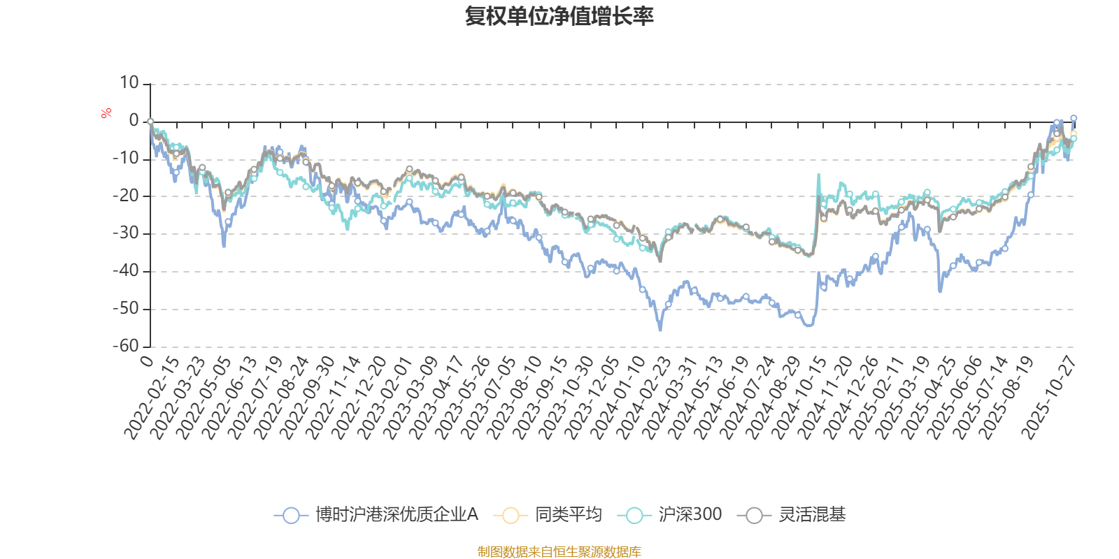 截至10月27日,博时沪港深优质企业A近三个月复权单位净值增长率为41.17%,位于同类可比基金90/1287;近半年复权单位净值增长率为63.77%,位于同类可比基金87/1287;近一年复权单位净值增长率为73.36%,位于同类可比基金54/1287;近三年复权单位净值增长率为24.58%,位于同类可比基金442/1286。