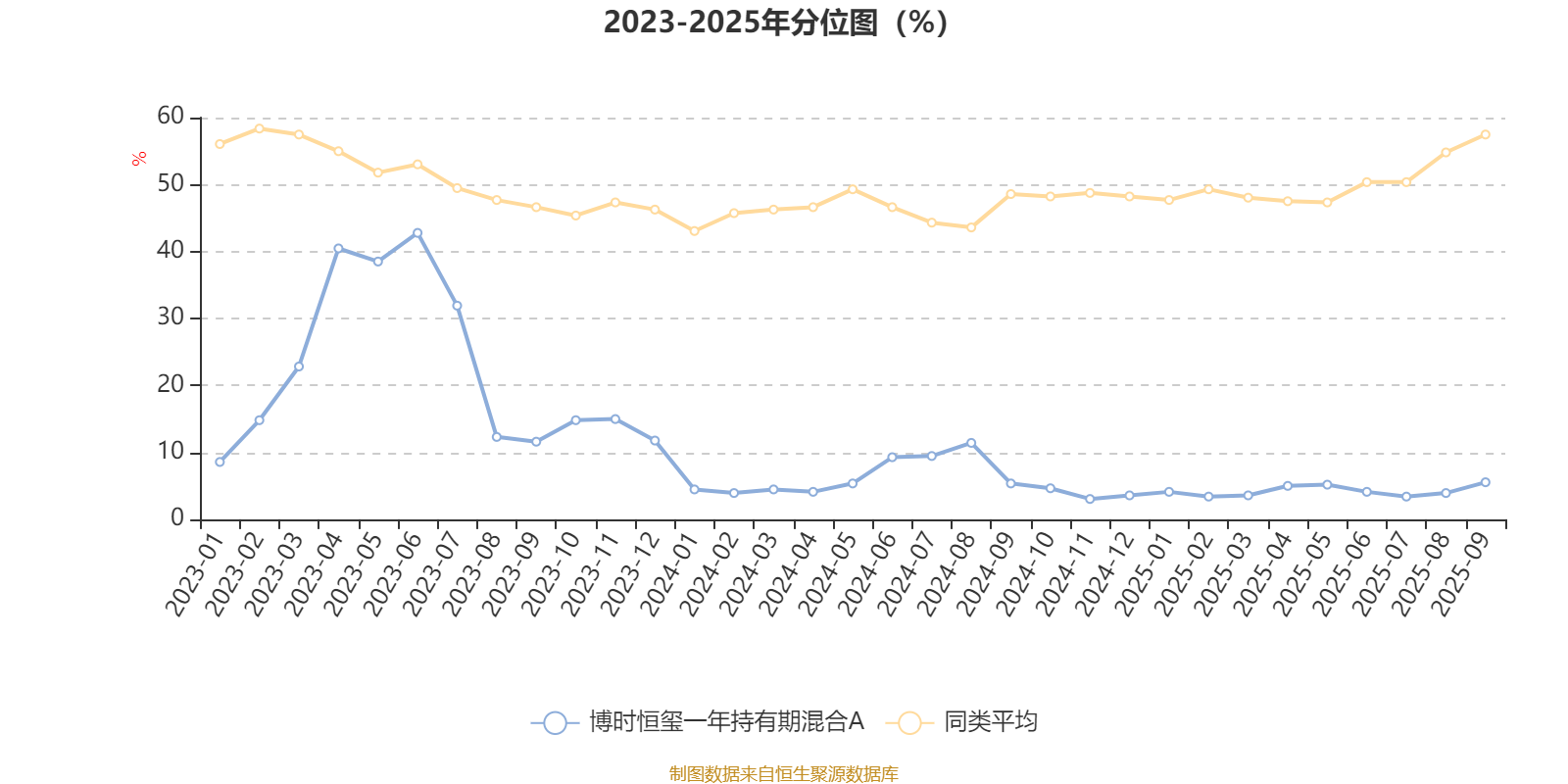 通过所选区间该基金净值增长率分位图,可以观察该基金与同类基金业绩比较情况。图为坐标原点到区间内某时点的净值增长率在同类基金中的分位数。
