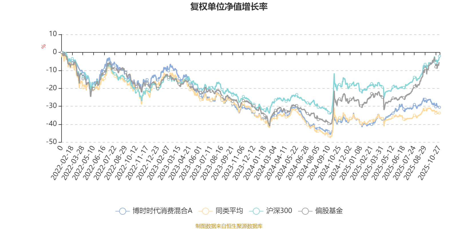 截至10月27日,博时时代消费混合A近三个月复权单位净值增长率为-1.84%,位于同类可比基金71/85;近半年复权单位净值增长率为7.51%,位于同类可比基金32/85;近一年复权单位净值增长率为12.02%,位于同类可比基金25/82;近三年复权单位净值增长率为-12.41%,位于同类可比基金59/74。