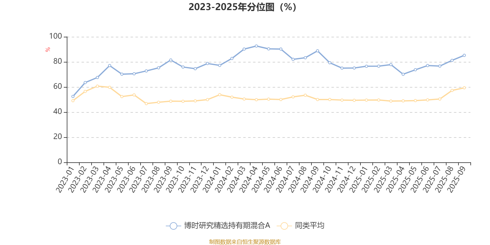 通过所选区间该基金净值增长率分位图,可以观察该基金与同类基金业绩比较情况。图为坐标原点到区间内某时点的净值增长率在同类基金中的分位数。