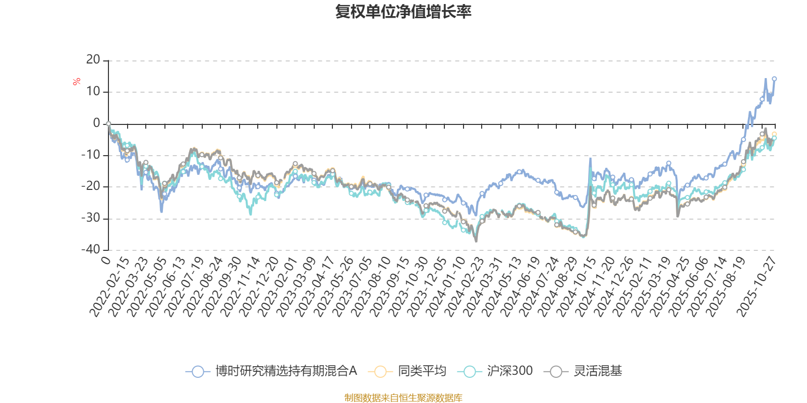 截至10月27日,博时研究精选持有期混合A近三个月复权单位净值增长率为26.01%,位于同类可比基金255/1287;近半年复权单位净值增长率为41.77%,位于同类可比基金245/1287;近一年复权单位净值增长率为35.82%,位于同类可比基金328/1287;近三年复权单位净值增长率为41.88%,位于同类可比基金191/1286。