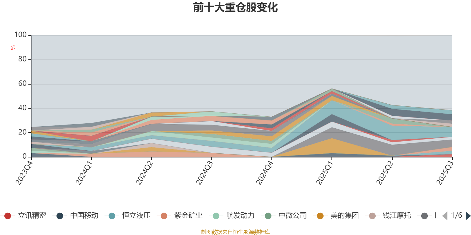 截至2025年三季度末,基金十大重仓股分别是宁德时代、腾讯控股、中国平安、杭州银行、紫金矿业、恒立液压、伊利股份、豪威集团、贵州茅台、立讯精密。