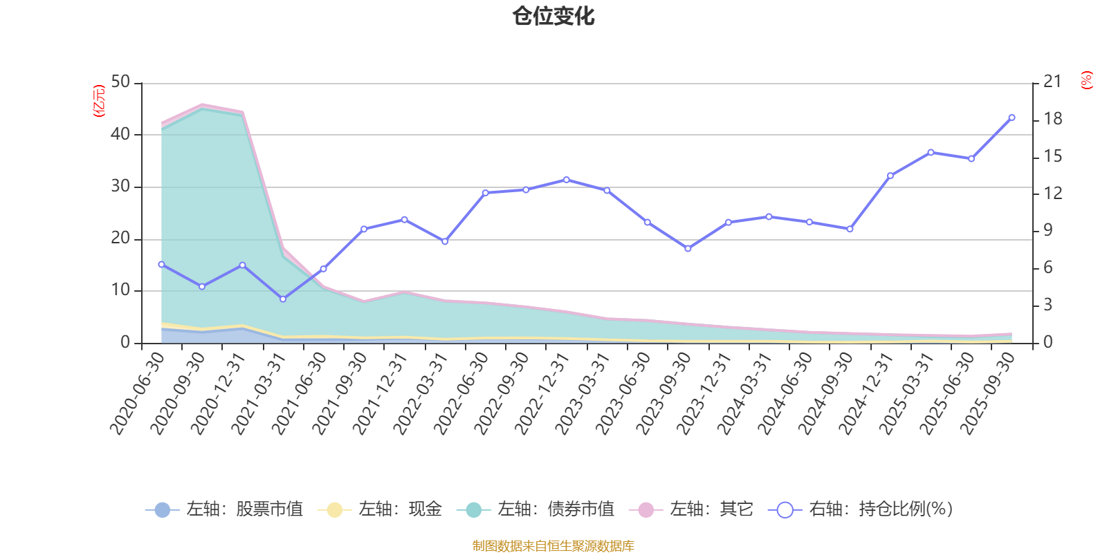 据定期报告数据统计,近三年平均股票仓位为11.99%,同类平均为19.03%。2025年三季度末基金达到18.21%的最高仓位,2021年一季度末最低,为3.56%。
