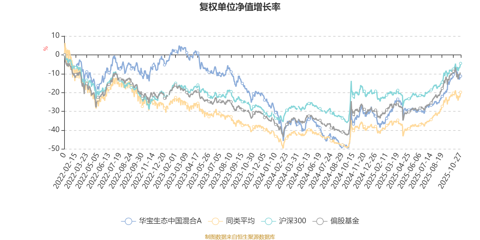 截至10月27日,华宝生态中国混合A近三个月复权单位净值增长率为18.03%,位于同类可比基金249/621;近半年复权单位净值增长率为25.39%,位于同类可比基金376/619;近一年复权单位净值增长率为31.41%,位于同类可比基金283/611;近三年复权单位净值增长率为-0.48%,位于同类可比基金408/518。