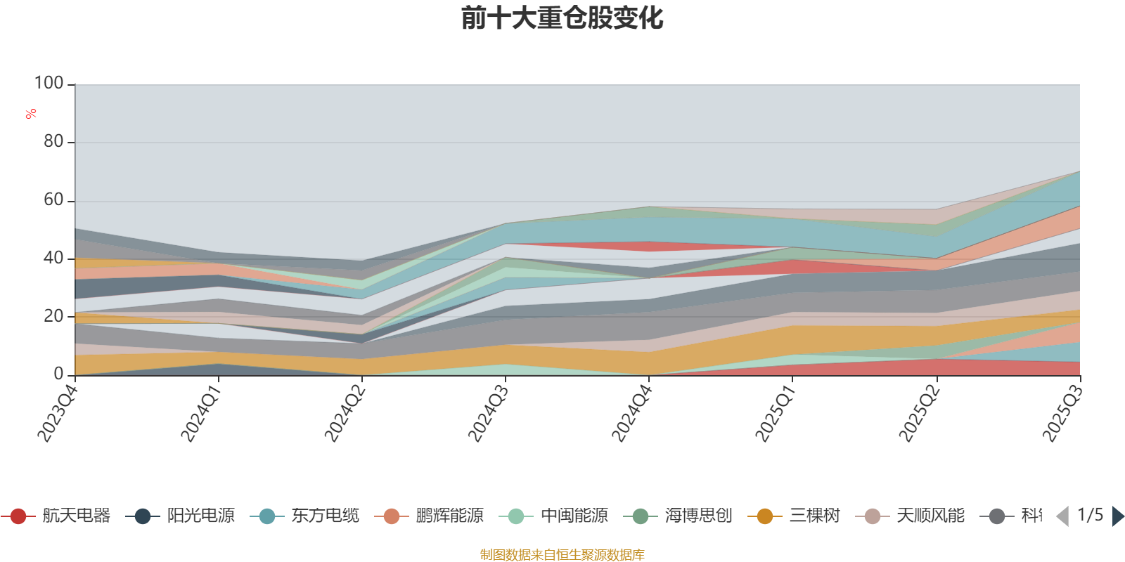 截至2025年三季度末,基金十大重仓股分别是亿纬锂能、固德威、海力风电、东方电缆、鹏辉能源、科锐国际、天顺风能、宁德时代、航天电器、三棵树。