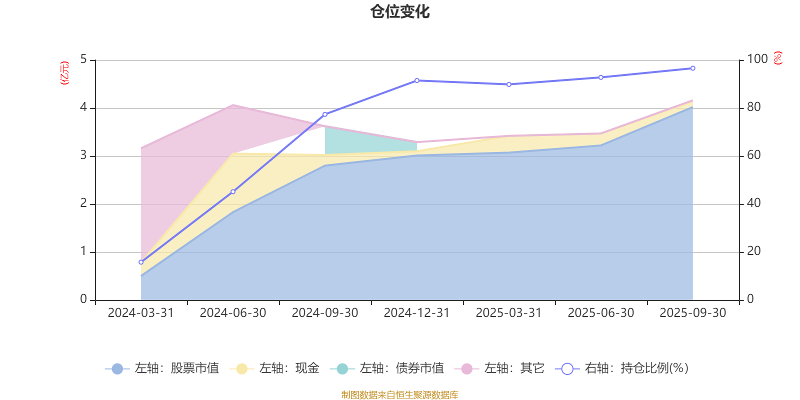 据定期报告数据统计,成立以来平均股票仓位为72.69%,同类平均为85.51%。2025年三季度末基金达到96.57%的最高仓位,2024年一季度末最低,为15.76%。