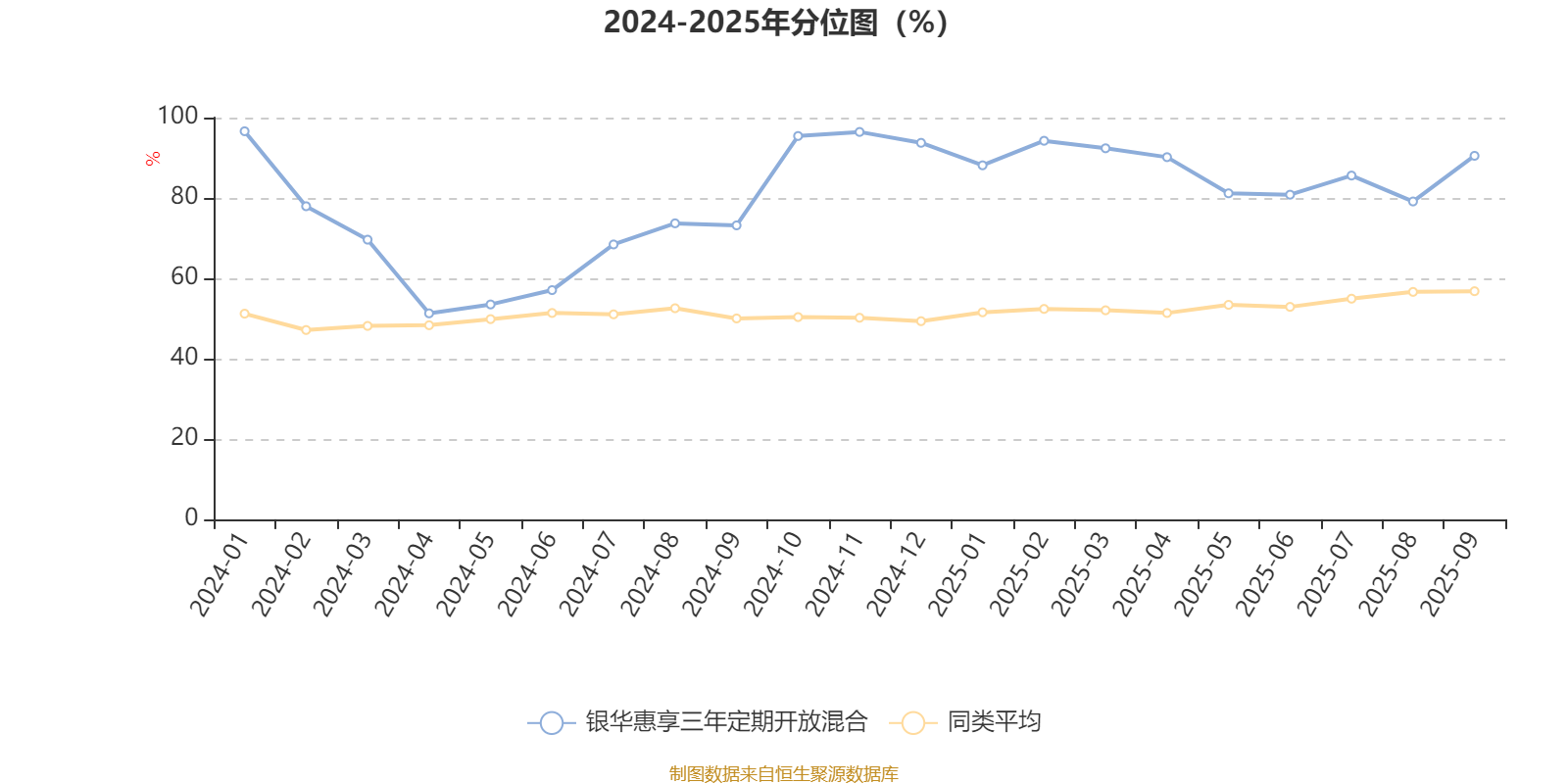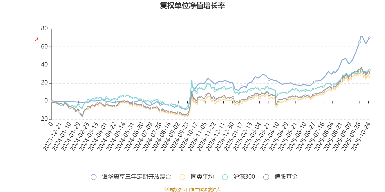 截至10月24日,银华惠享三年定期开放混合近三个月复权单位净值增长率为33.91%,位于同类可比基金52/621;近半年复权单位净值增长率为43.49%,位于同类可比基金109/618;近一年复权单位净值增长率为44.60%,位于同类可比基金134/611。