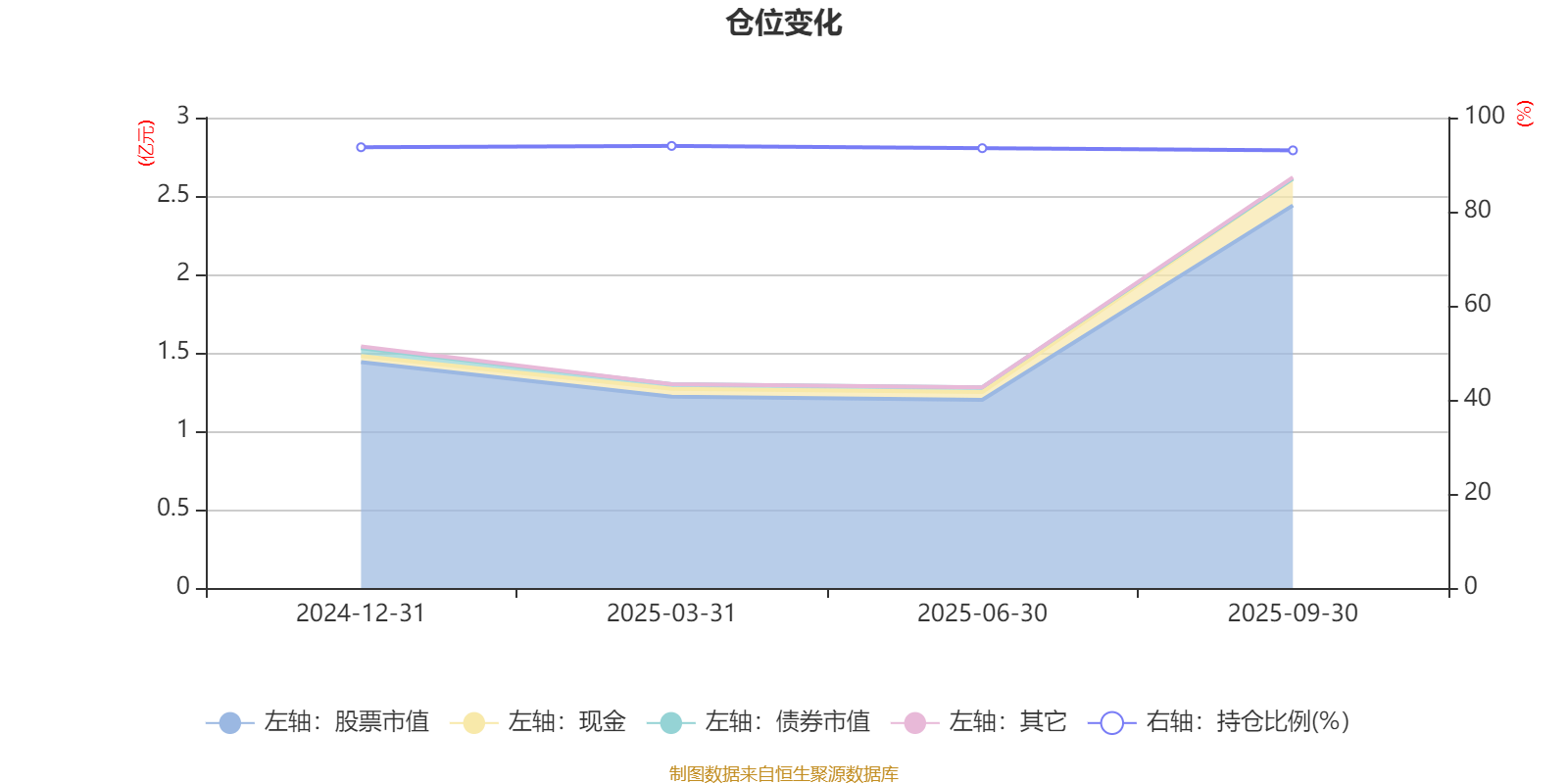 据定期报告数据统计,基金股票仓位长期保持较高水平,成立以来平均股票仓位为93.56%,同类平均为85.51%。2025年一季度末基金达到93.98%的最高仓位,2025年三季度末最低,为93.04%。