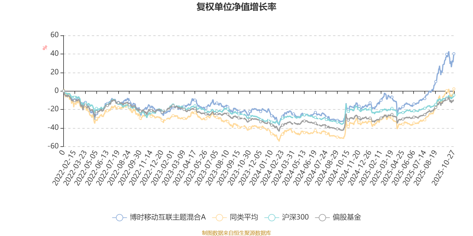 截至10月27日,博时移动互联主题混合A近三个月复权单位净值增长率为42.32%,位于同类可比基金97/229;近半年复权单位净值增长率为68.91%,位于同类可比基金73/229;近一年复权单位净值增长率为68.97%,位于同类可比基金62/213;近三年复权单位净值增长率为72.27%,位于同类可比基金41/158。