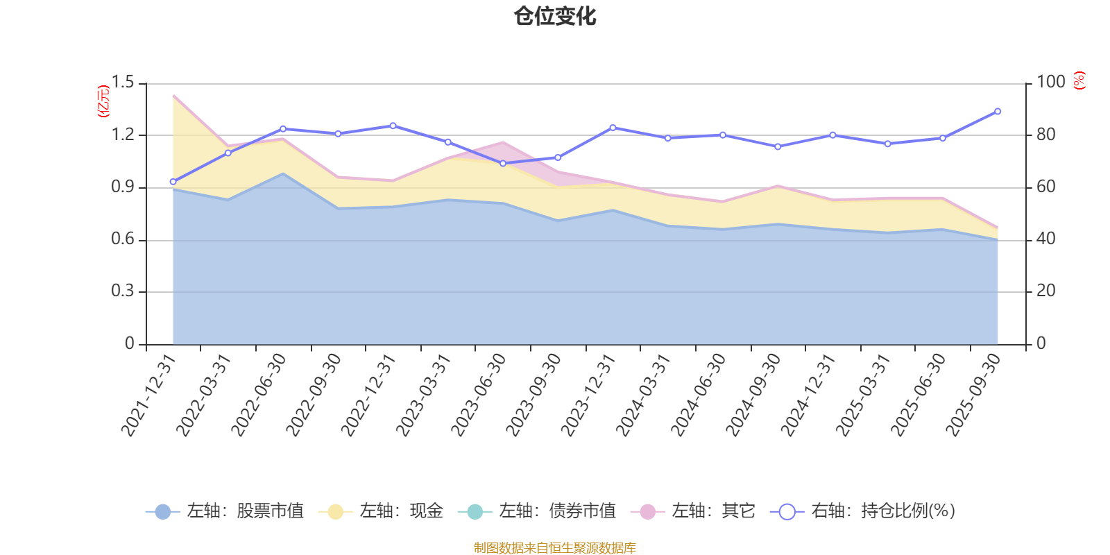 据定期报告数据统计,近三年平均股票仓位为78.77%,同类平均为86.7%。2025年三季度末基金达到89.25%的最高仓位,2021年末最低,为62.32%。
