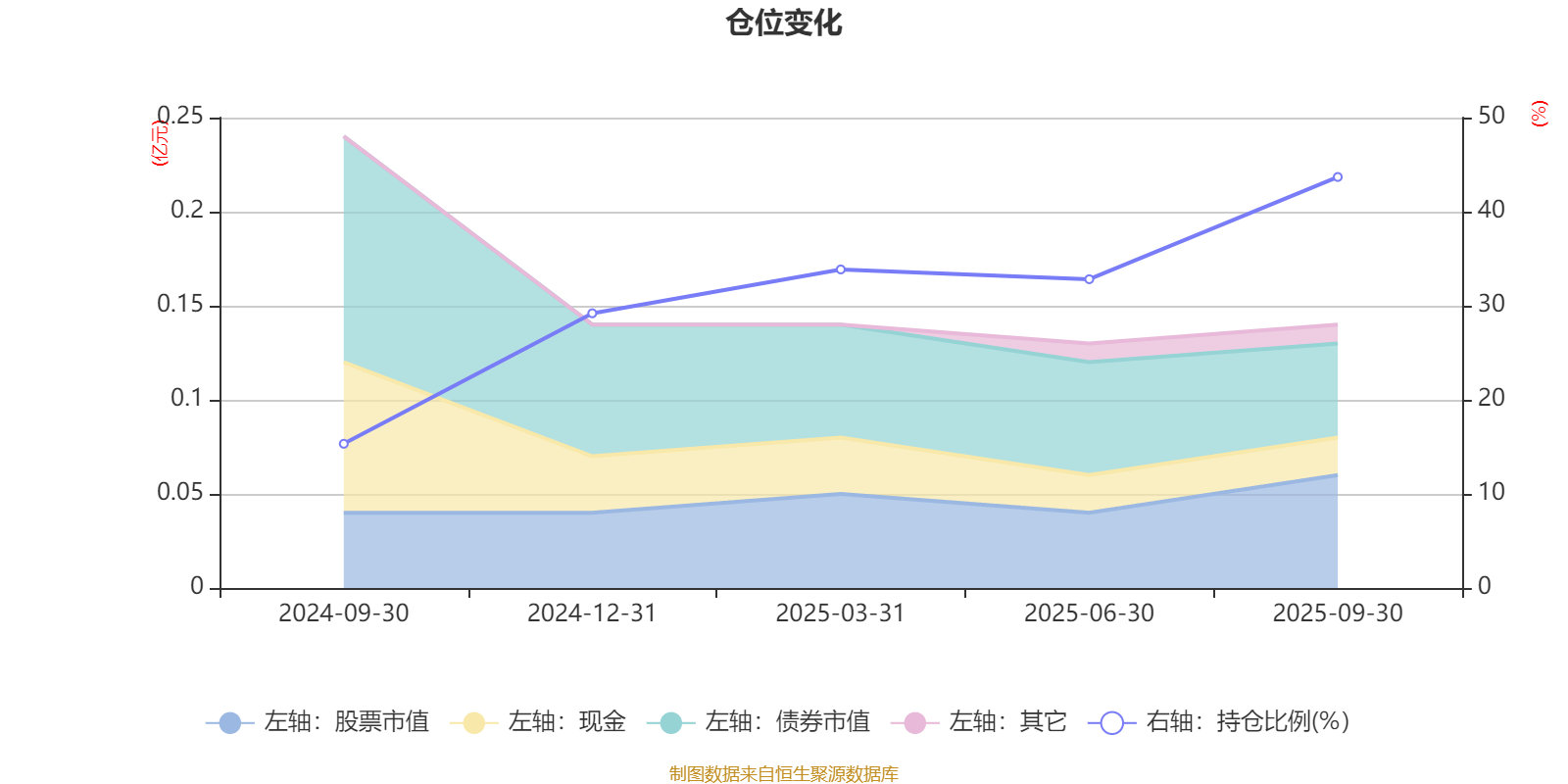 据定期报告数据统计,成立以来平均股票仓位为30.98%,同类平均为67.23%。2025年三季度末基金达到43.69%的最高仓位,2024年三季度末最低,为15.33%。