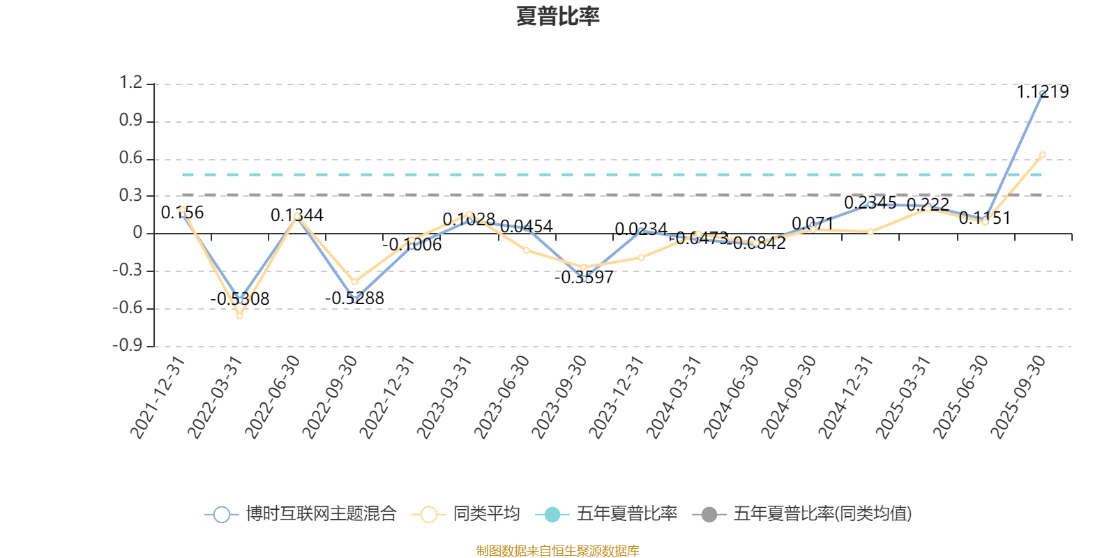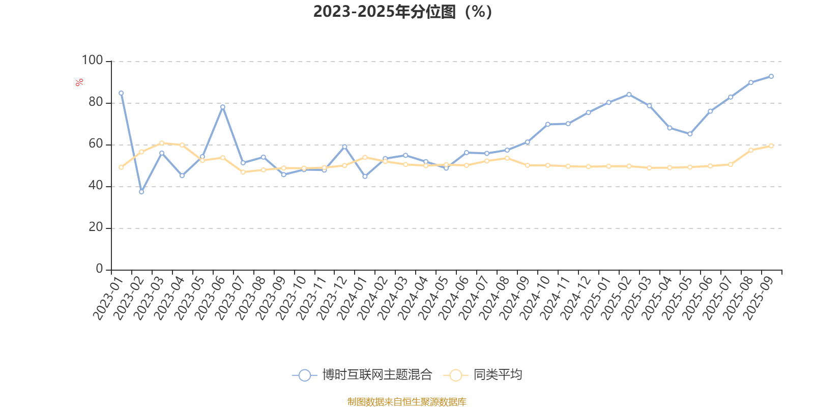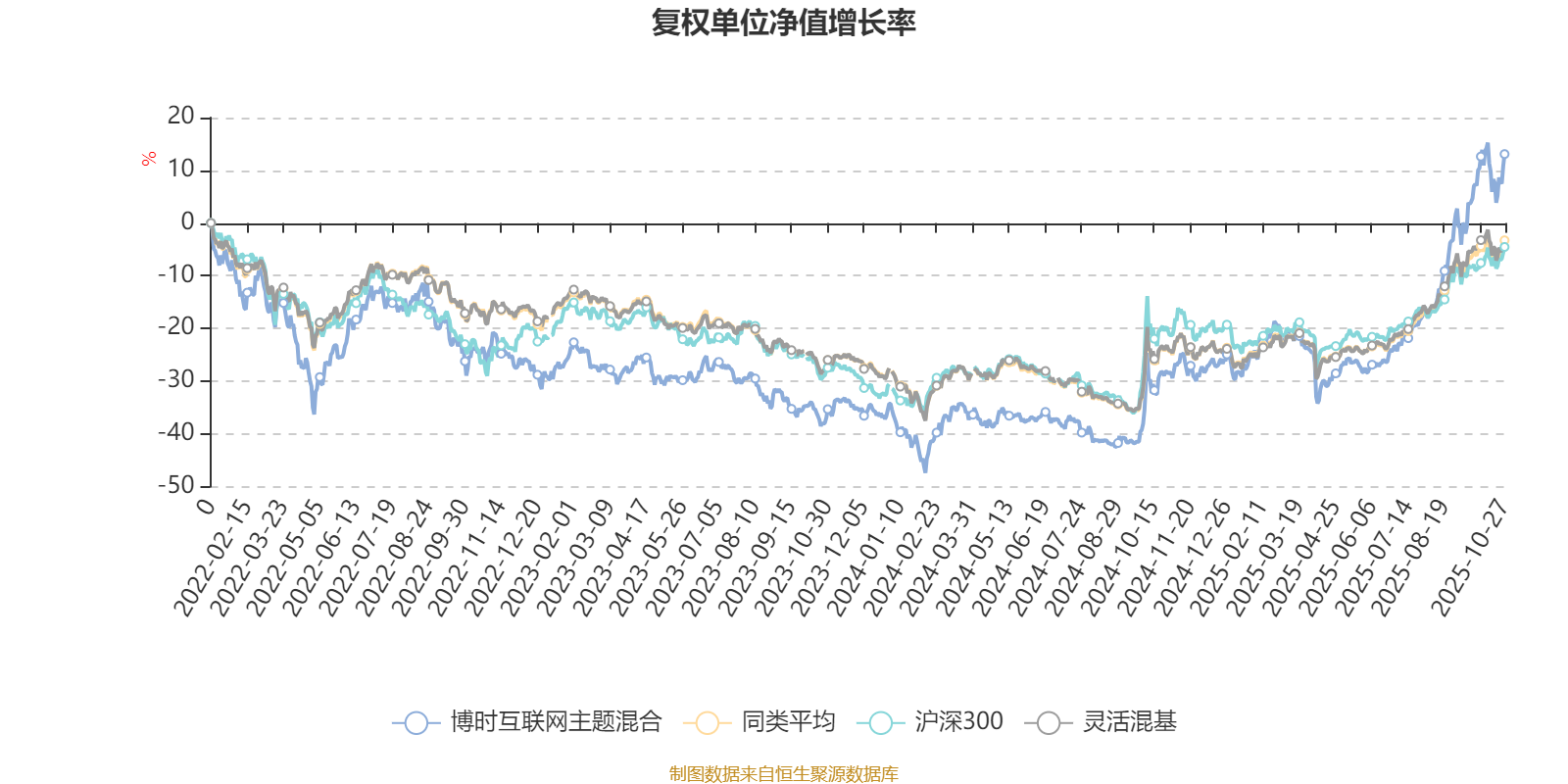 截至10月27日,博时互联网主题混合近三个月复权单位净值增长率为38.10%,位于同类可比基金120/1287;近半年复权单位净值增长率为58.19%,位于同类可比基金106/1287;近一年复权单位净值增长率为57.47%,位于同类可比基金106/1287;近三年复权单位净值增长率为50.09%,位于同类可比基金137/1286。