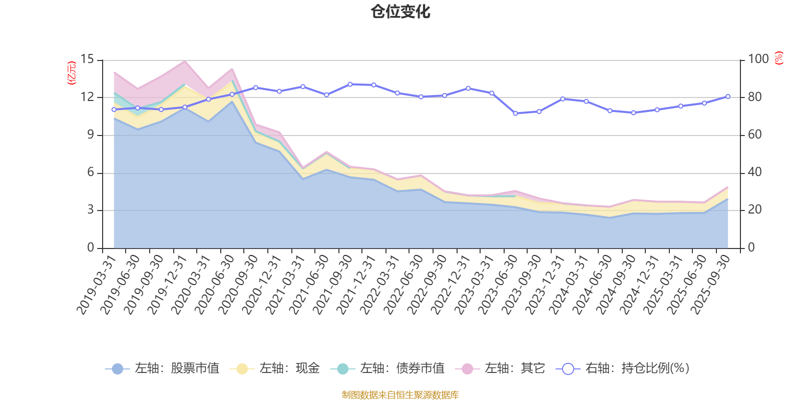 据定期报告数据统计,近三年平均股票仓位为76.74%,同类平均为72.17%。2021年三季度末基金达到87.09%的最高仓位,2023年上半年末最低,为71.64%。