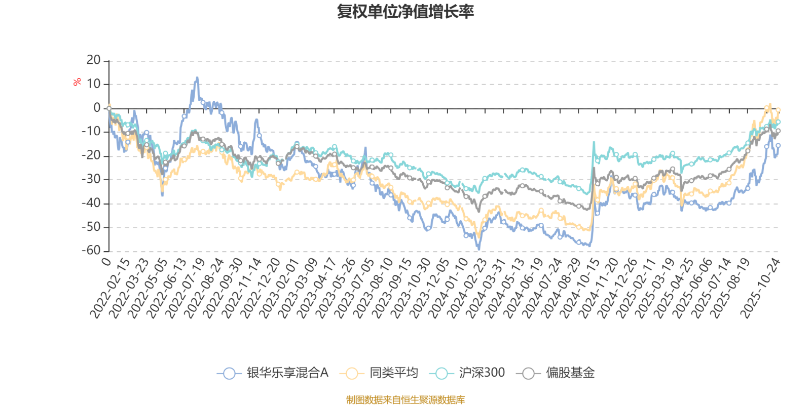 截至10月24日,银华乐享混合A近三个月复权单位净值增长率为29.96%,位于同类可比基金149/229;近半年复权单位净值增长率为40.90%,位于同类可比基金148/229;近一年复权单位净值增长率为42.85%,位于同类可比基金148/213;近三年复权单位净值增长率为2.53%,位于同类可比基金149/158。