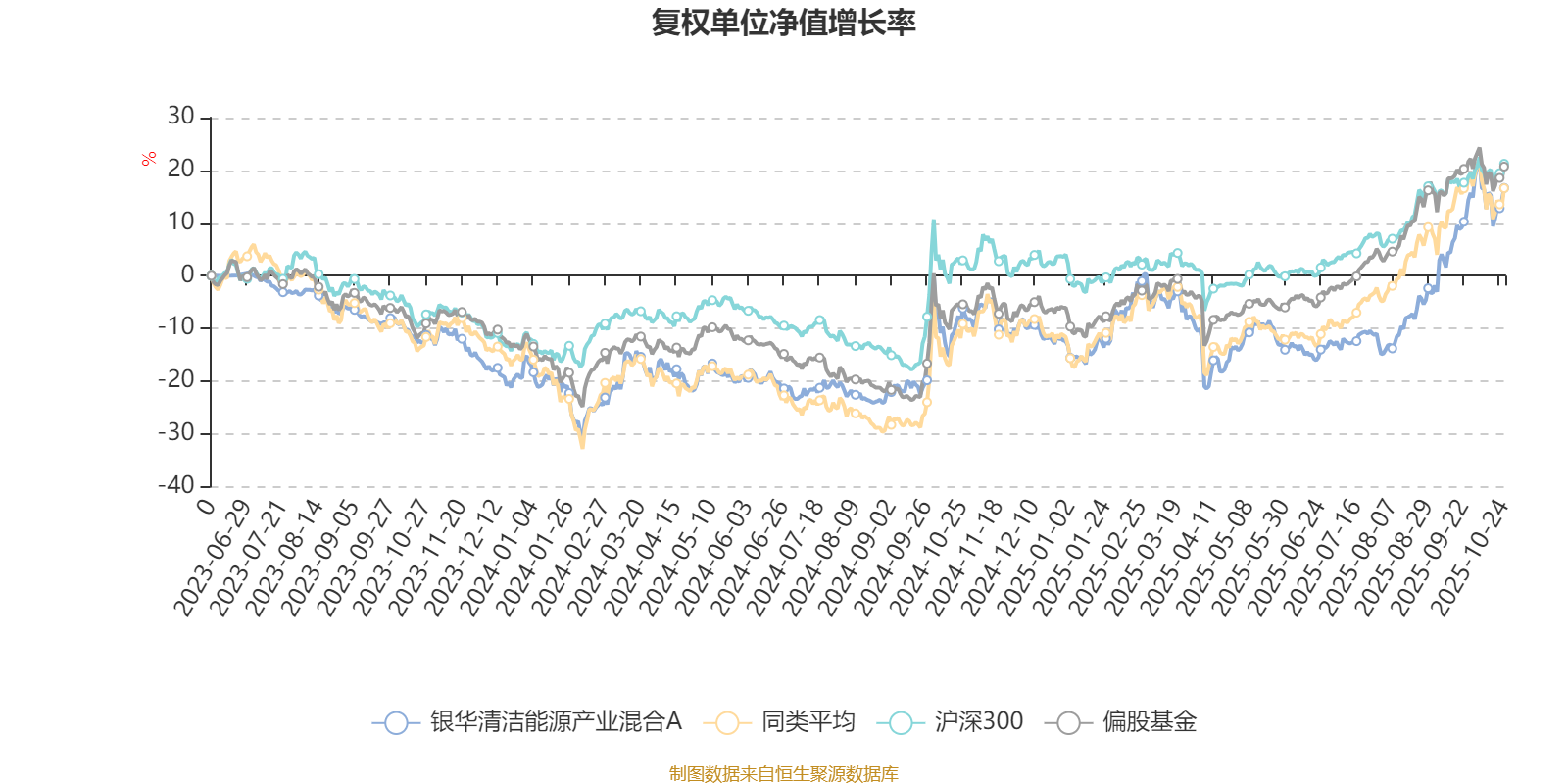 截至10月24日,银华清洁能源产业混合A近三个月复权单位净值增长率为30.26%,位于同类可比基金22/100;近半年复权单位净值增长率为35.40%,位于同类可比基金39/99;近一年复权单位净值增长率为29.18%,位于同类可比基金40/90。