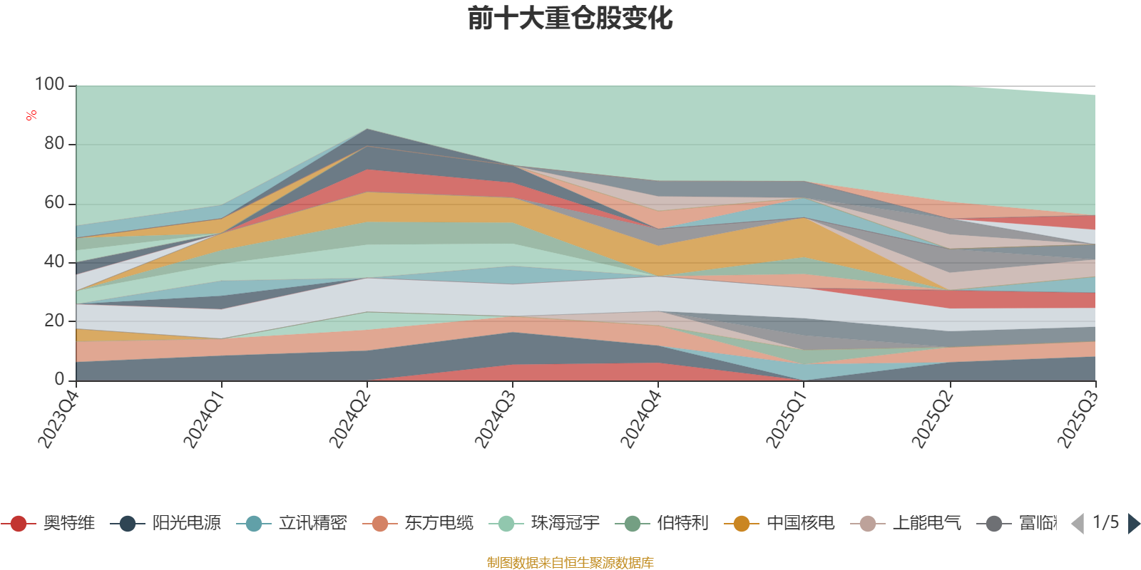该基金持股集中度较高。截至2025年三季度末,基金十大重仓股分别是阳光电源、宁德时代、金风科技、阿特斯、东方电缆、大金重工、新强联、欣旺达、科达利、亿纬锂能。