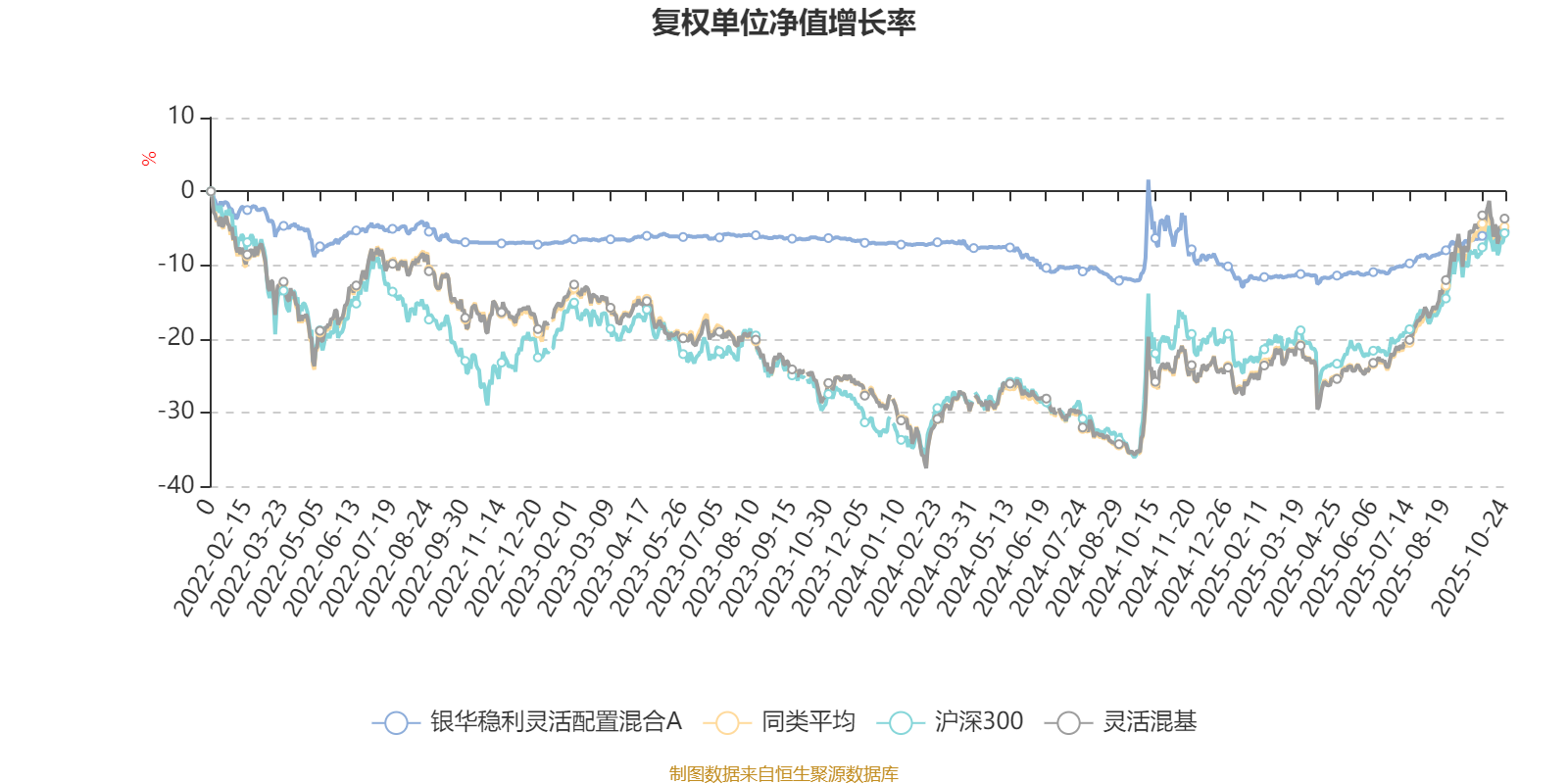 截至10月24日,银华稳利灵活配置混合A近三个月复权单位净值增长率为3.54%,位于同类可比基金983/1287;近半年复权单位净值增长率为6.85%,位于同类可比基金1078/1287;近一年复权单位净值增长率为-0.03%,位于同类可比基金1243/1287;近三年复权单位净值增长率为1.67%,位于同类可比基金937/1286。