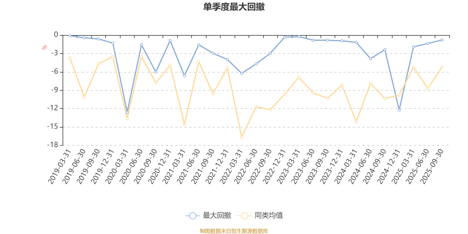 截至10月24日,基金近三年最大回撤为14.27%,同类可比基金排名185/1283。单季度最大回撤出现在2020年一季度,为12.61%。