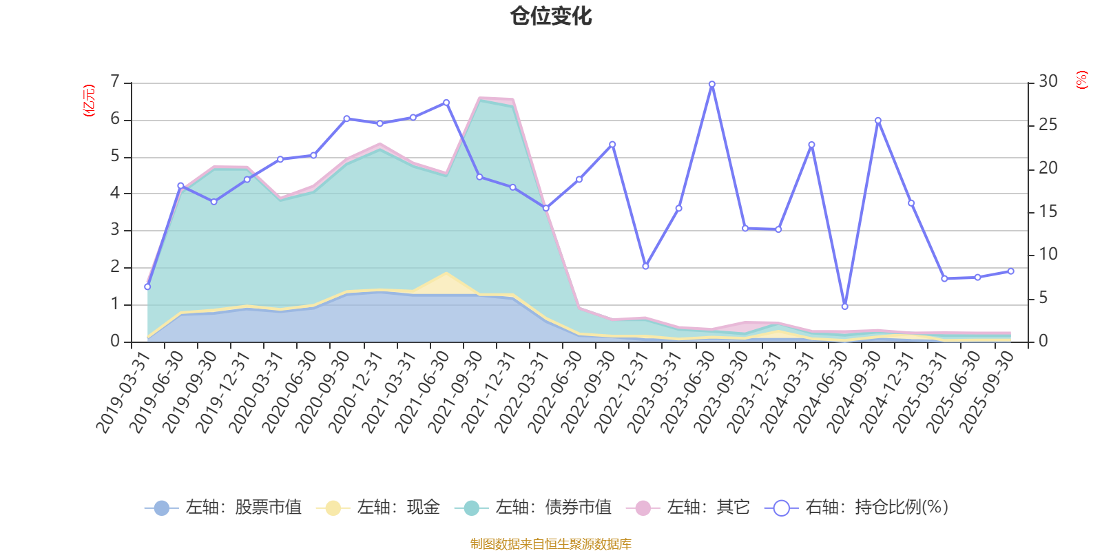 据定期报告数据统计,近三年平均股票仓位为14.32%,同类平均为72.16%。2023年上半年末基金达到29.83%的最高仓位,2024年上半年末最低,为4.1%。