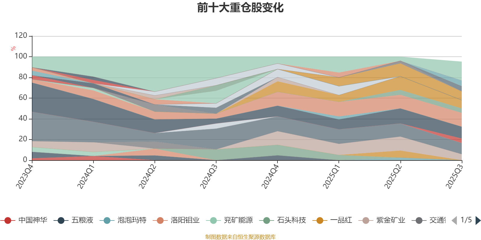 该基金持股集中度较高,近2年前十大重仓股集中度长期超过60%。截至2025年三季度末,基金十大重仓股分别是宁德时代、贵州茅台、腾讯控股、小米集团-W、迈瑞医疗、紫金矿业、山西汾酒、沪电股份、ST华通、老铺黄金。