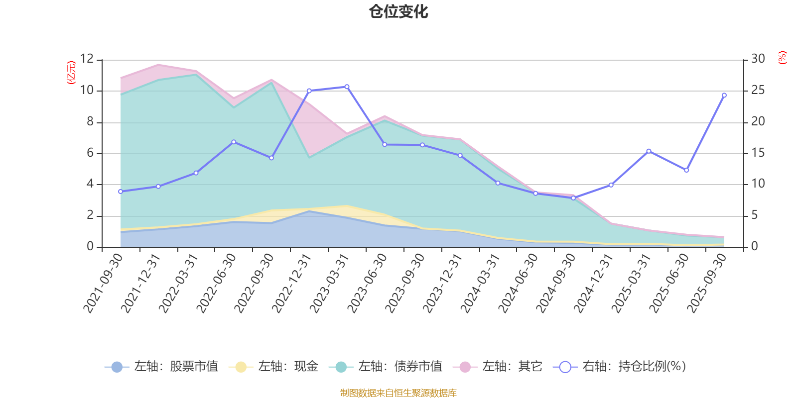基金管理人在三季报中表示,报告期内,本基金主要投资国债及高等级信用债,总体上组合久期灵活调整,增加波段操作,配合权益仓位抬升。权益仓位方面,三季度本基金减仓了 TMT、创新药、有色等,布局了受益于反内卷的周期类品种和低估值品种。后续看,关注年底重要会议可能带来的反内卷政策落地,我们会保持观察并寻找机会增加配置相关行业。