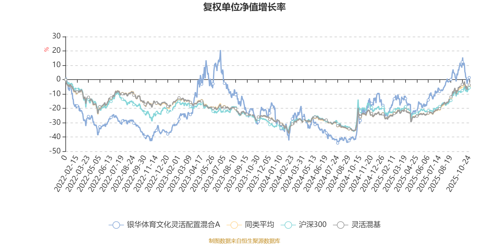 截至10月24日,银华体育文化灵活配置混合A近三个月复权单位净值增长率为9.01%,位于同类可比基金738/1287;近半年复权单位净值增长率为31.24%,位于同类可比基金417/1287;近一年复权单位净值增长率为32.28%,位于同类可比基金384/1287;近三年复权单位净值增长率为74.41%,位于同类可比基金48/1286。