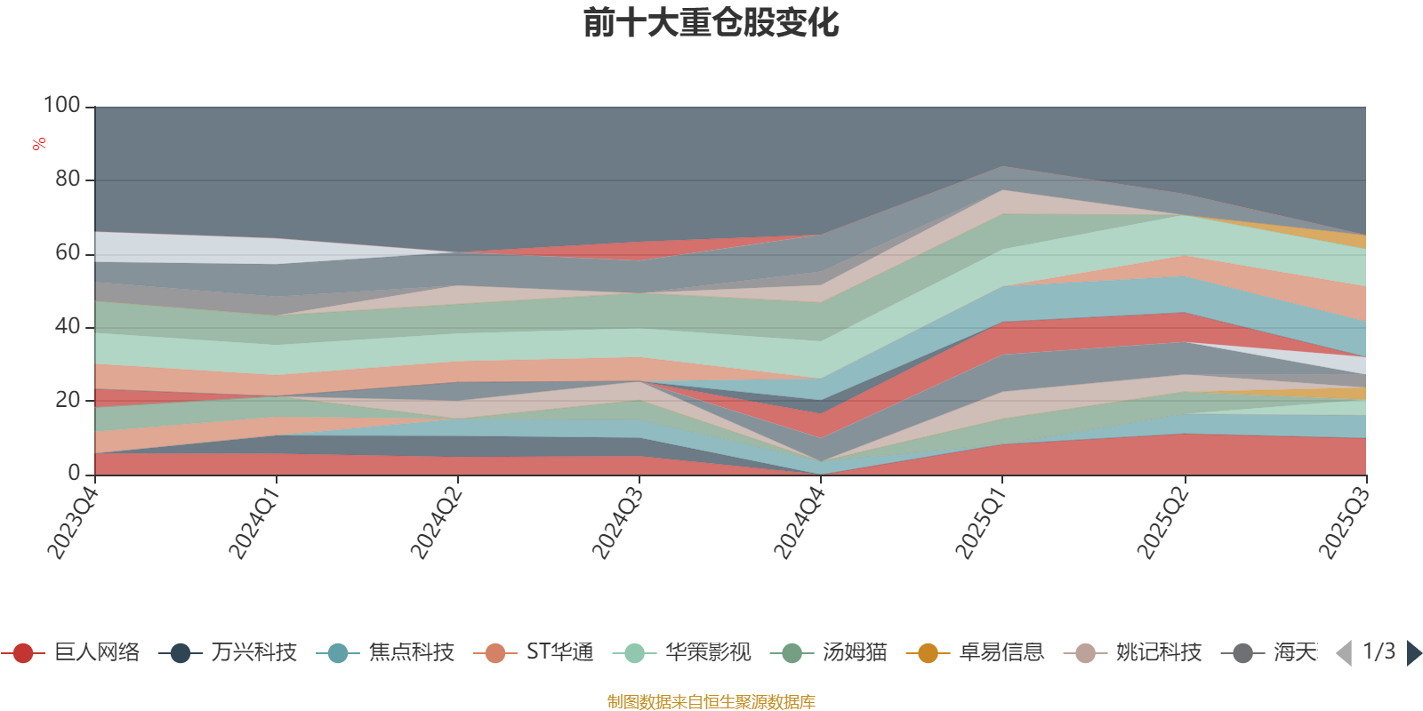 该基金持股集中度较高,近2年前十大重仓股集中度长期超过60%。截至2025年三季度末,基金十大重仓股分别是恺英网络、巨人网络、完美世界、吉比特、焦点科技、金山办公、华策影视、鼎捷数智、海天瑞声、卓易信息。