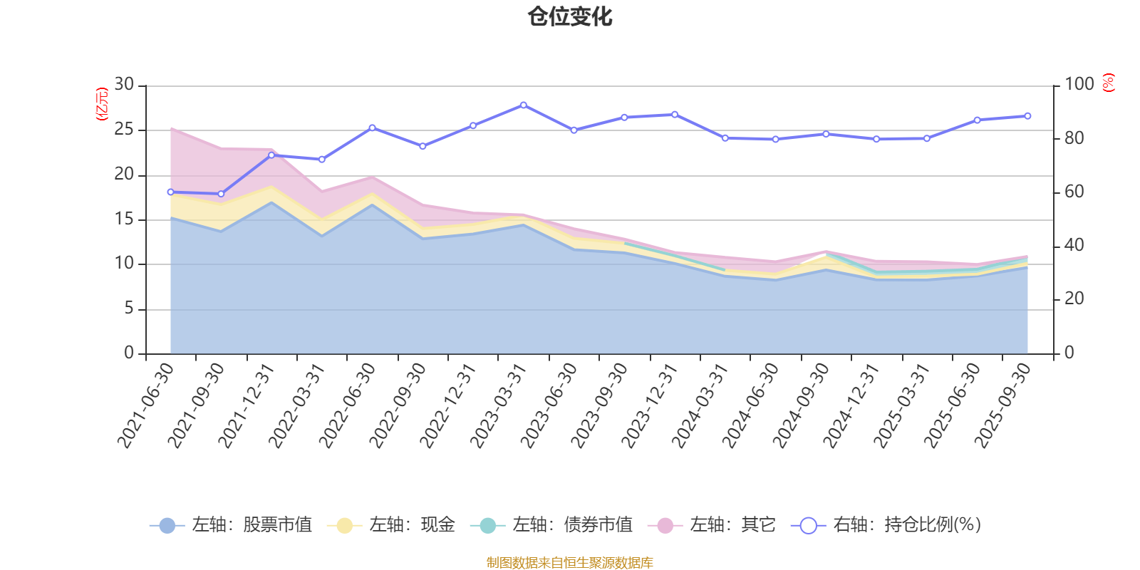 据定期报告数据统计,近三年平均股票仓位为84.73%,同类平均为85.88%。2023年一季度末基金达到92.71%的最高仓位,2021年三季度末最低,为59.6%。