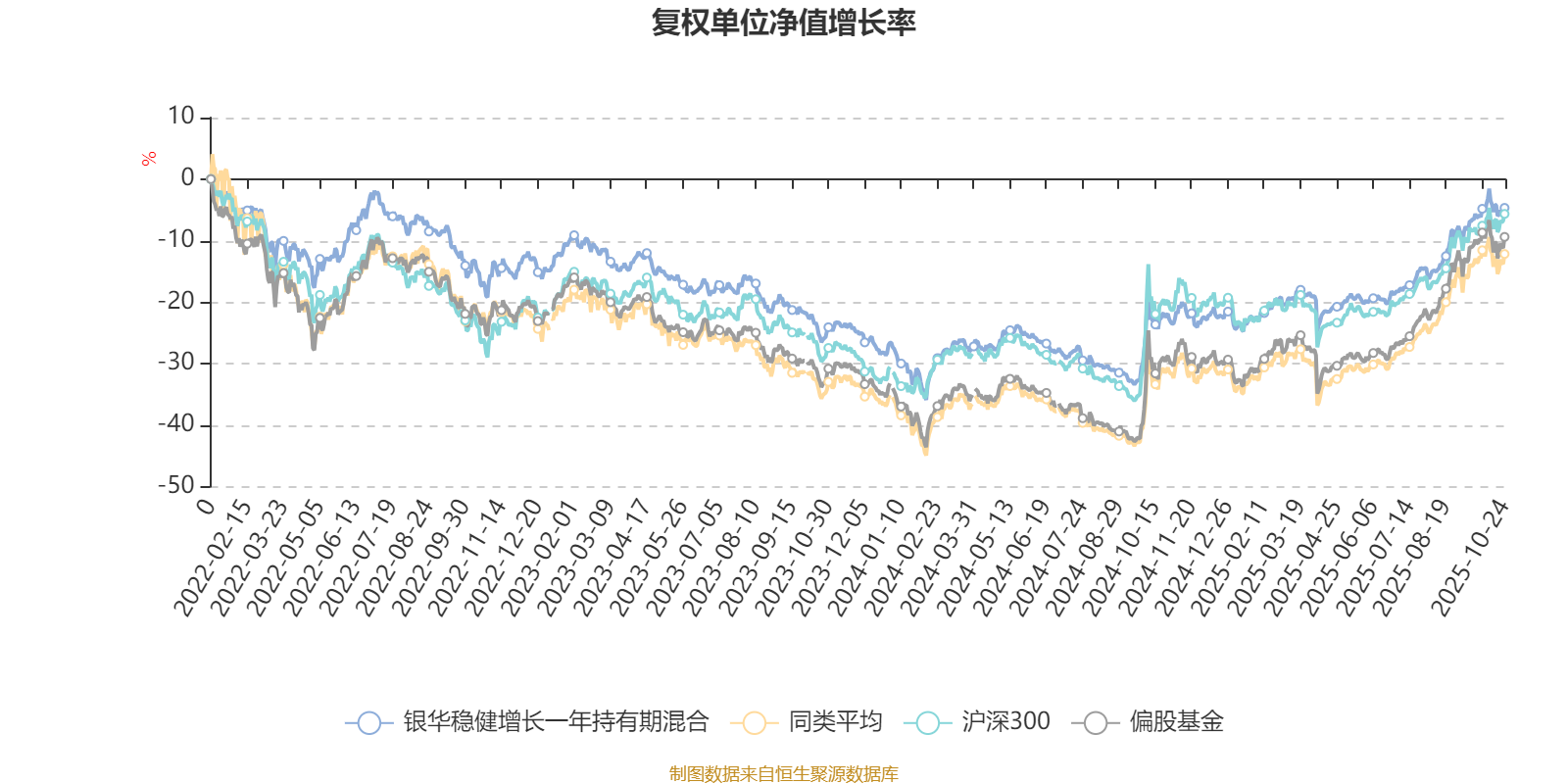 截至10月24日,银华稳健增长一年持有期混合近三个月复权单位净值增长率为11.34%,位于同类可比基金164/265;近半年复权单位净值增长率为20.34%,位于同类可比基金190/265;近一年复权单位净值增长率为23.00%,位于同类可比基金169/265;近三年复权单位净值增长率为15.11%,位于同类可比基金141/253。