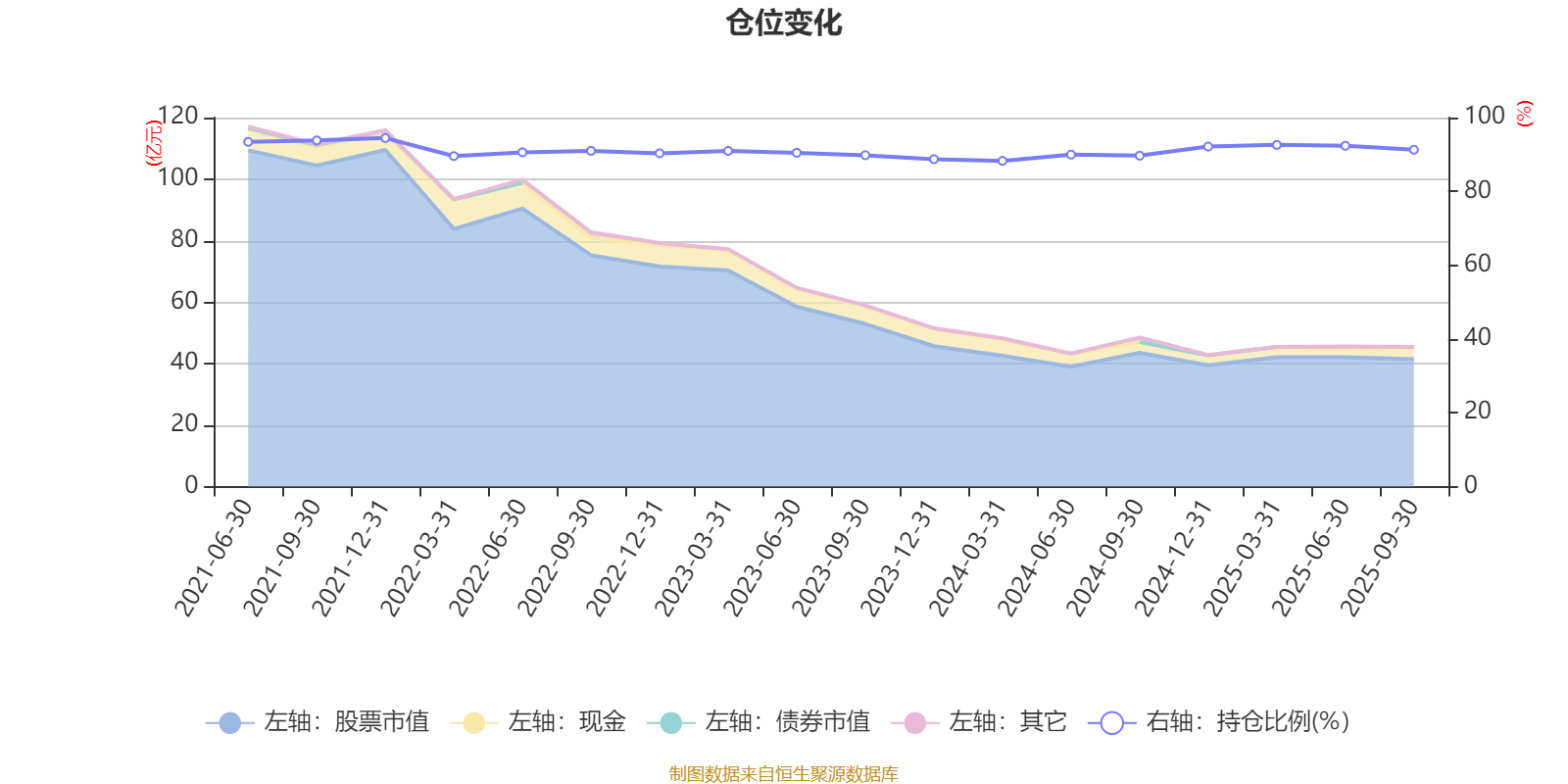 据定期报告数据统计,近三年平均股票仓位为90.55%,同类平均为85.99%。2021年末基金达到94.46%的最高仓位,2024年一季度末最低,为88.27%。