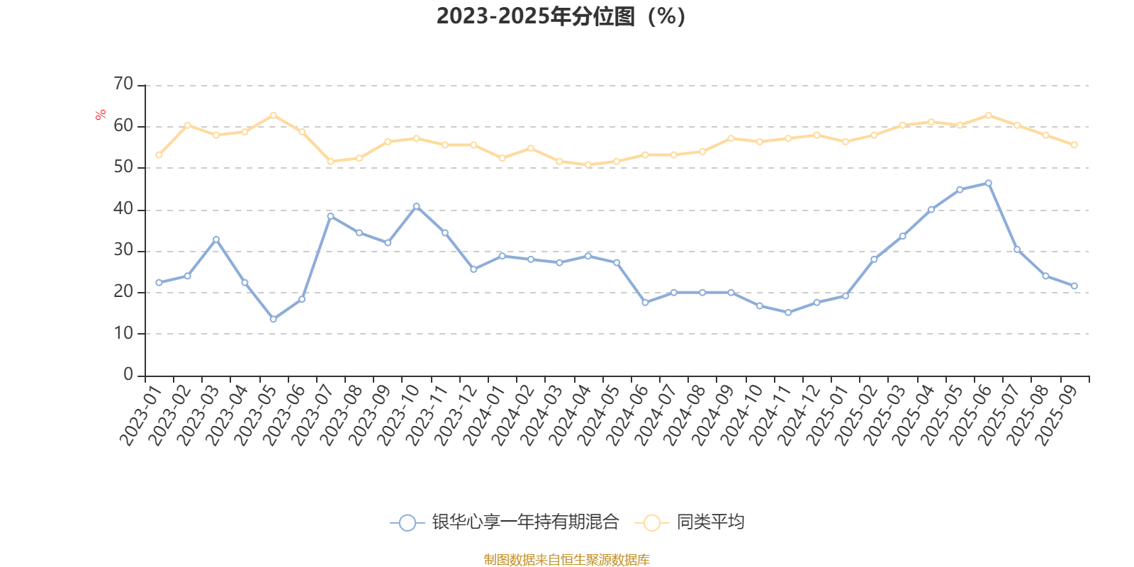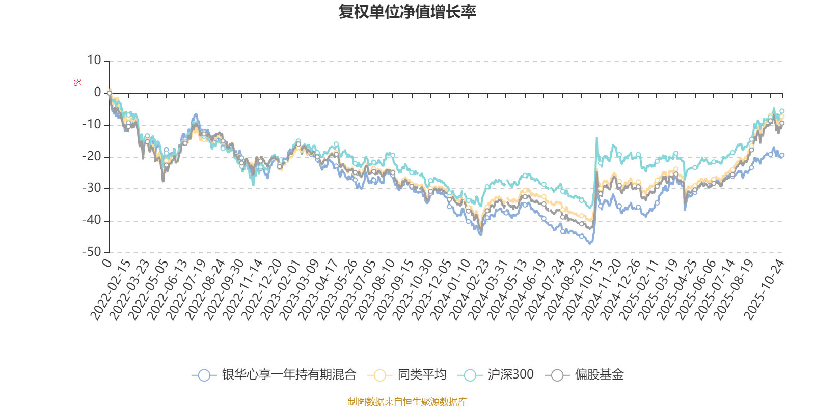 截至10月24日,银华心享一年持有期混合近三个月复权单位净值增长率为6.50%,位于同类可比基金101/130;近半年复权单位净值增长率为16.54%,位于同类可比基金100/130;近一年复权单位净值增长率为22.37%,位于同类可比基金79/130;近三年复权单位净值增长率为6.97%,位于同类可比基金93/124。